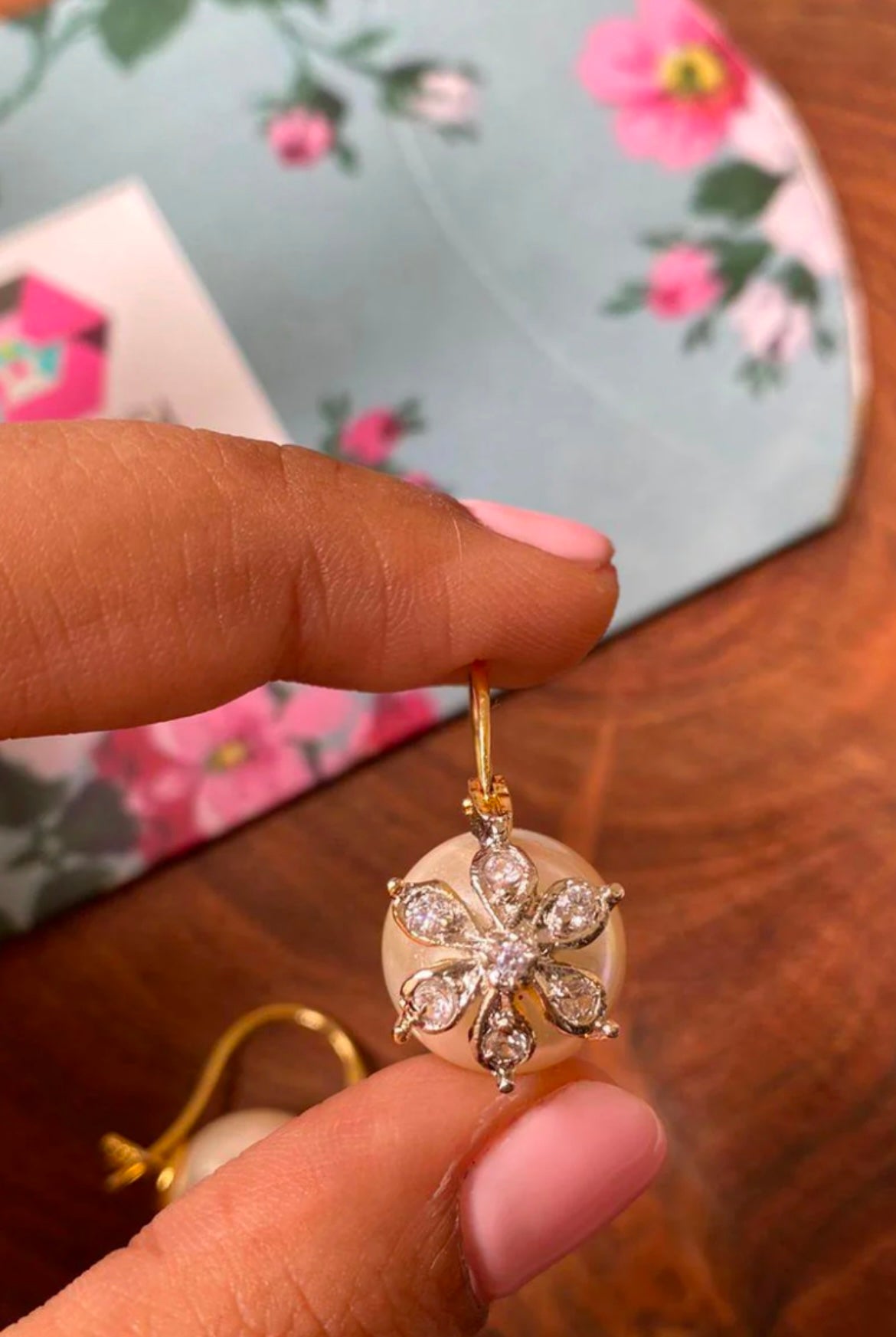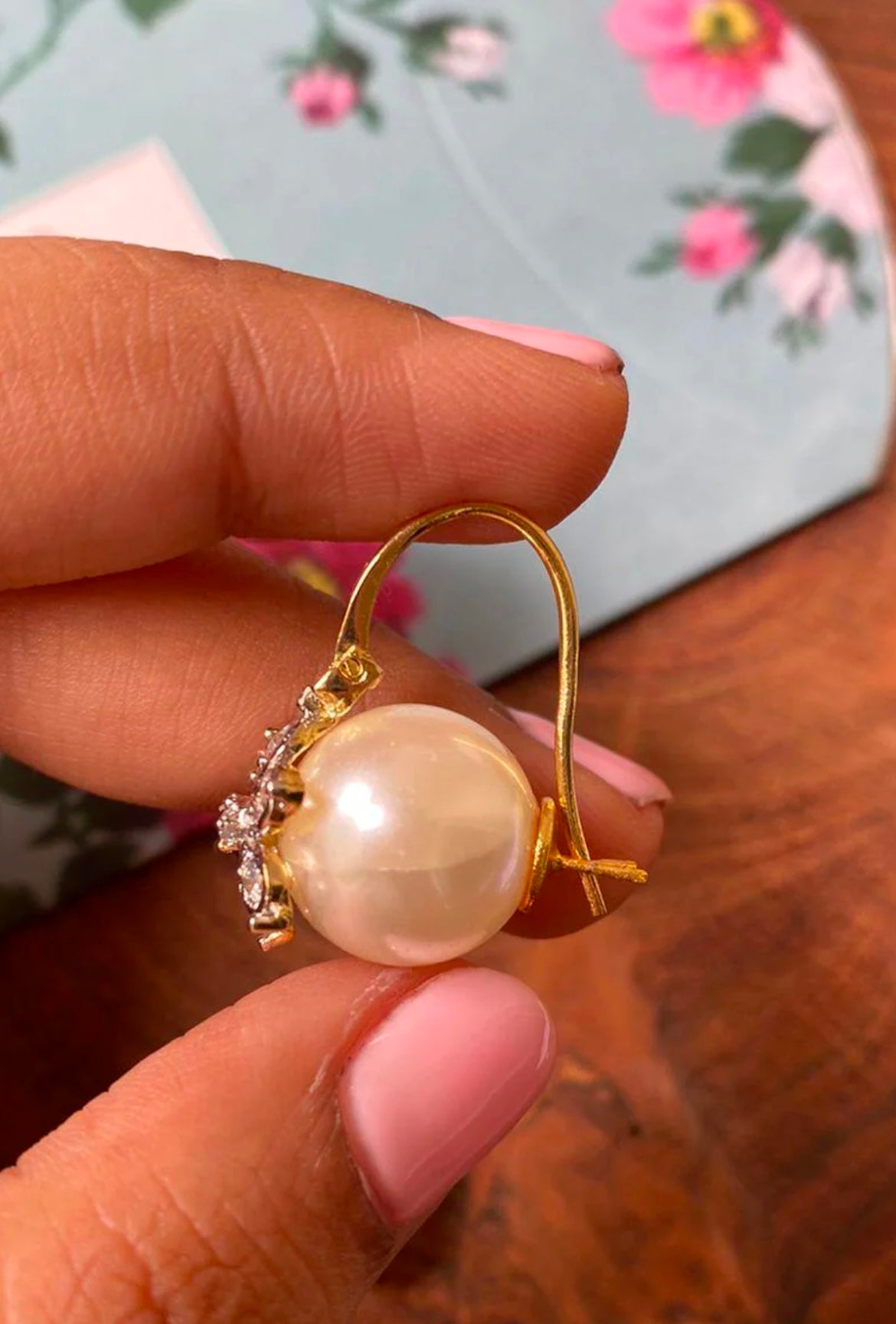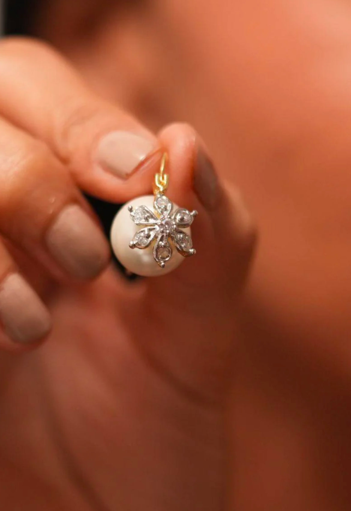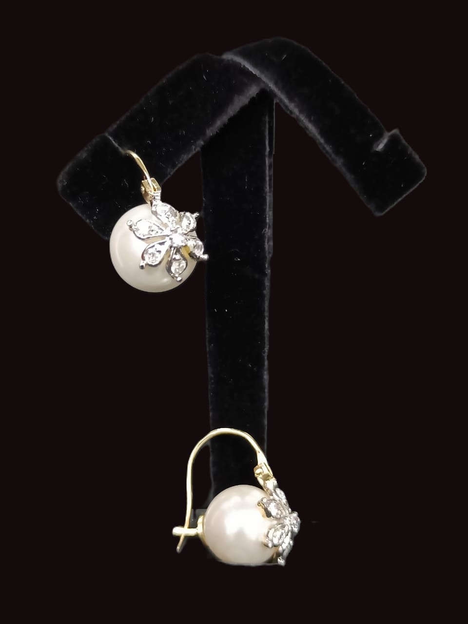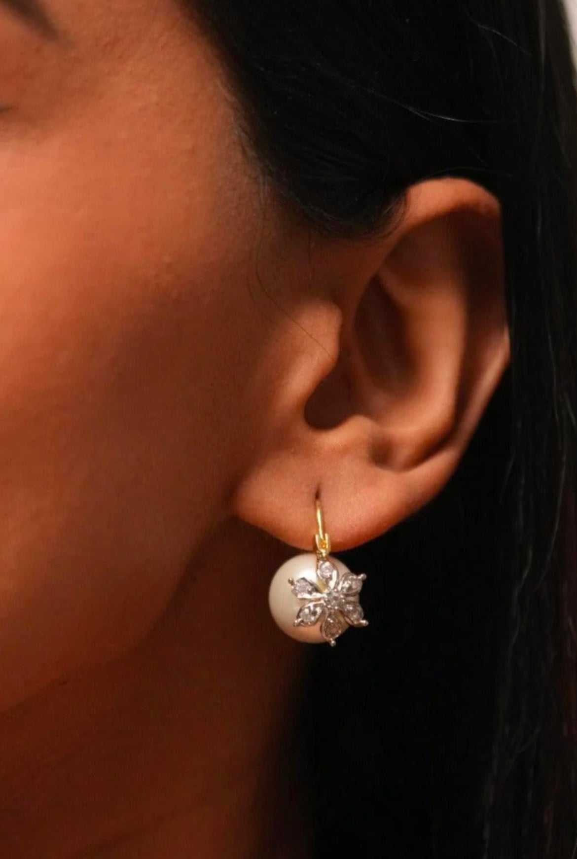 Delicate pearl drop earrings adorned with a sparkling floral diamond motif, offering timeless elegance with a touch of charm.