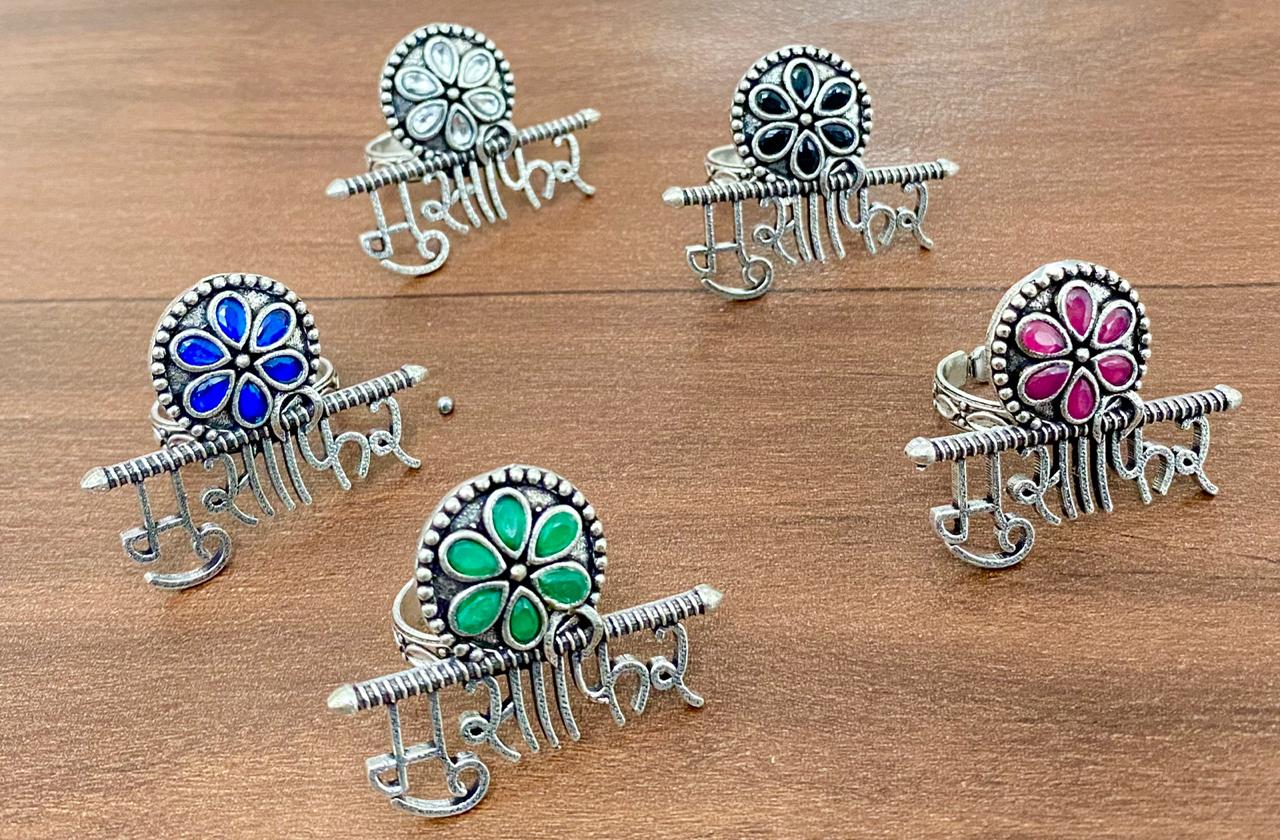 These colorful rings feature intricate flower designs paired with the Hindi text (Musafir), meaning "traveler." Their vibrant patterns and symbolic charm make them a meaningful statement accessory.