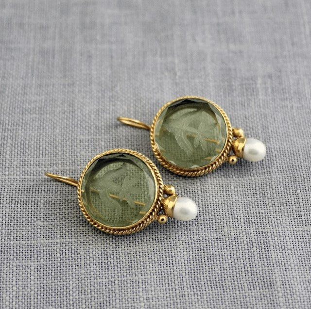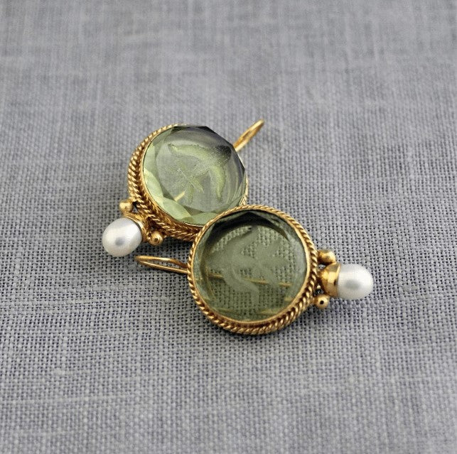 A pair of drop earrings featuring round, faceted pale green colored stone with textured gold border, adding a touch of elegance.