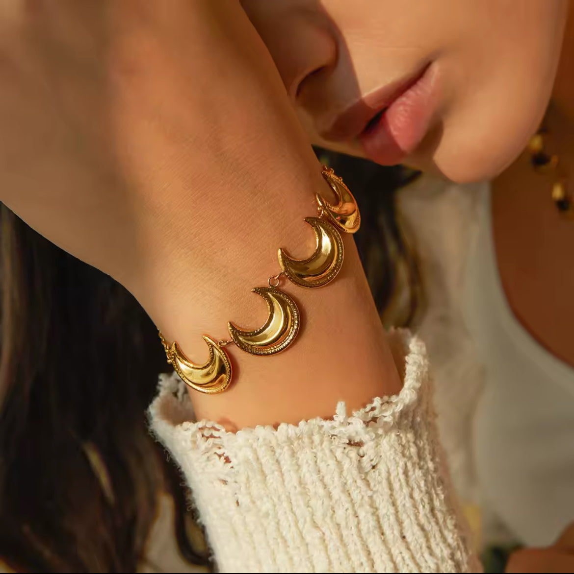 The bracelet features crescent moon charms, made of polished gold metal, minimalist and elegant design.