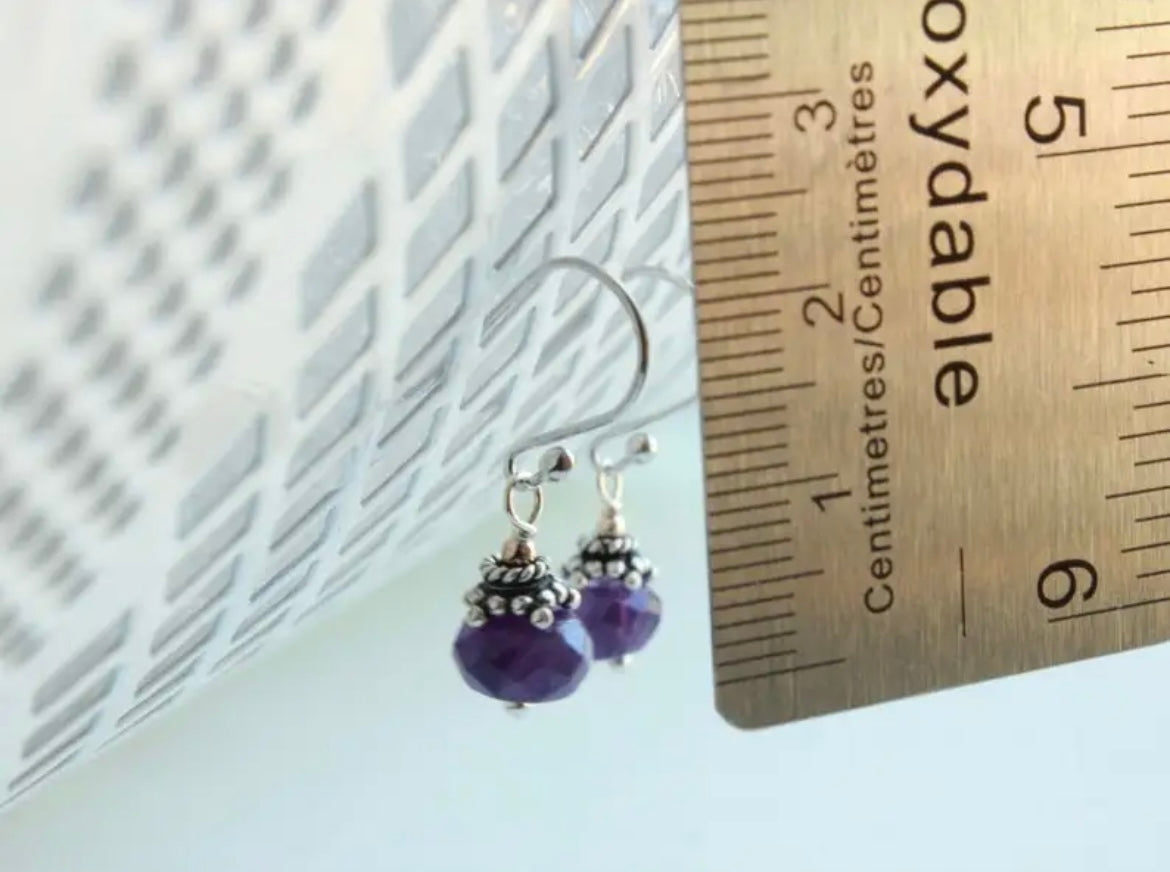 The earrings appear handmade and have a vintage or artisanal aesthetics with amethyst stone as a small drop with sterling silver loop.