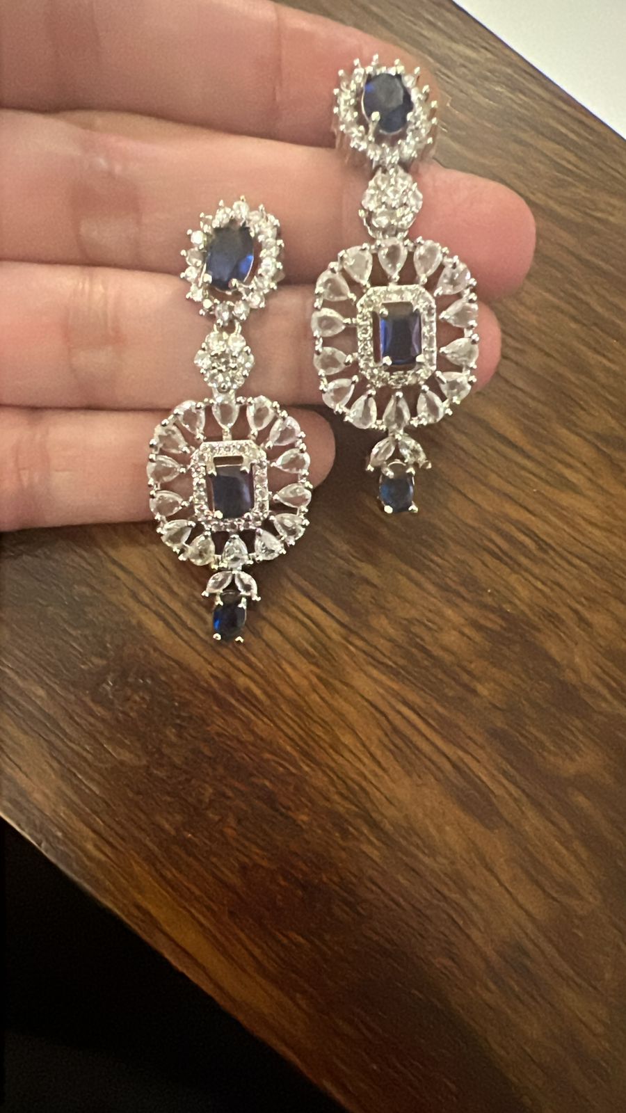 Elegant earrings featuring deep blue gemstones and radiant clear stones in intricate floral and geometric arrangements, exuding timeless sophistication.