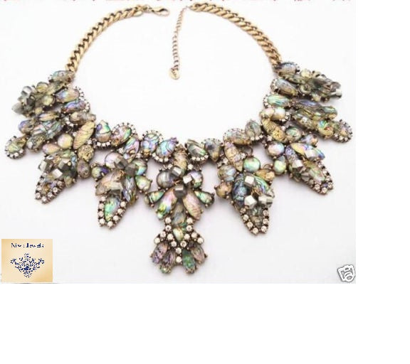 A gold necklace adorned with iridescent stones in green, purple, and blue, featuring an intricate floral-inspired design.