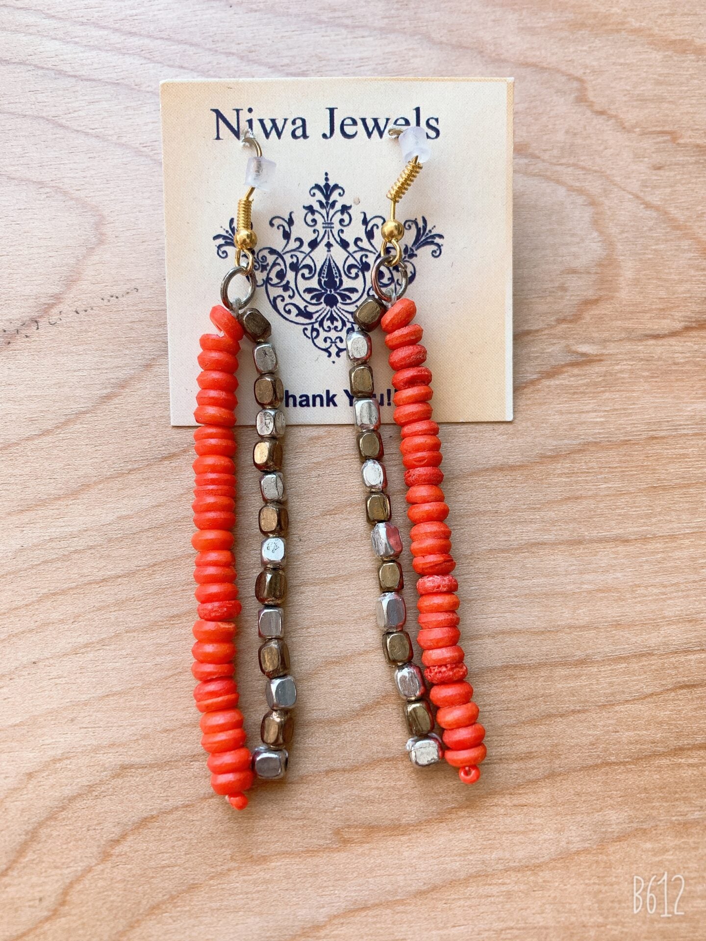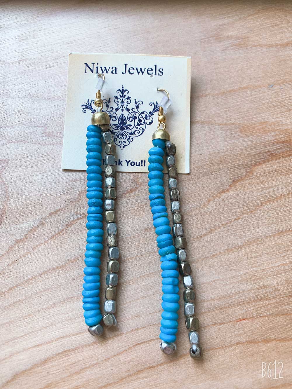 Handcrafted earrings with turquoise and metallic cube beads, creating a unique, refined charm with subtle sophistication.