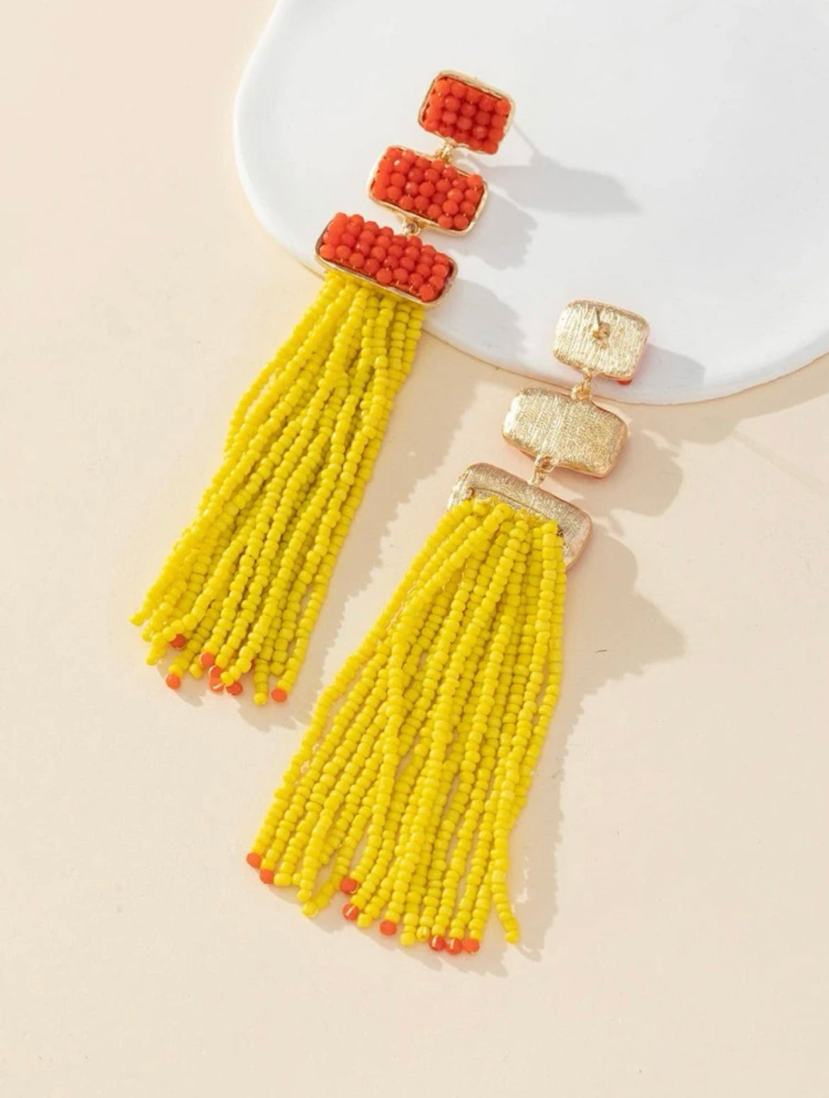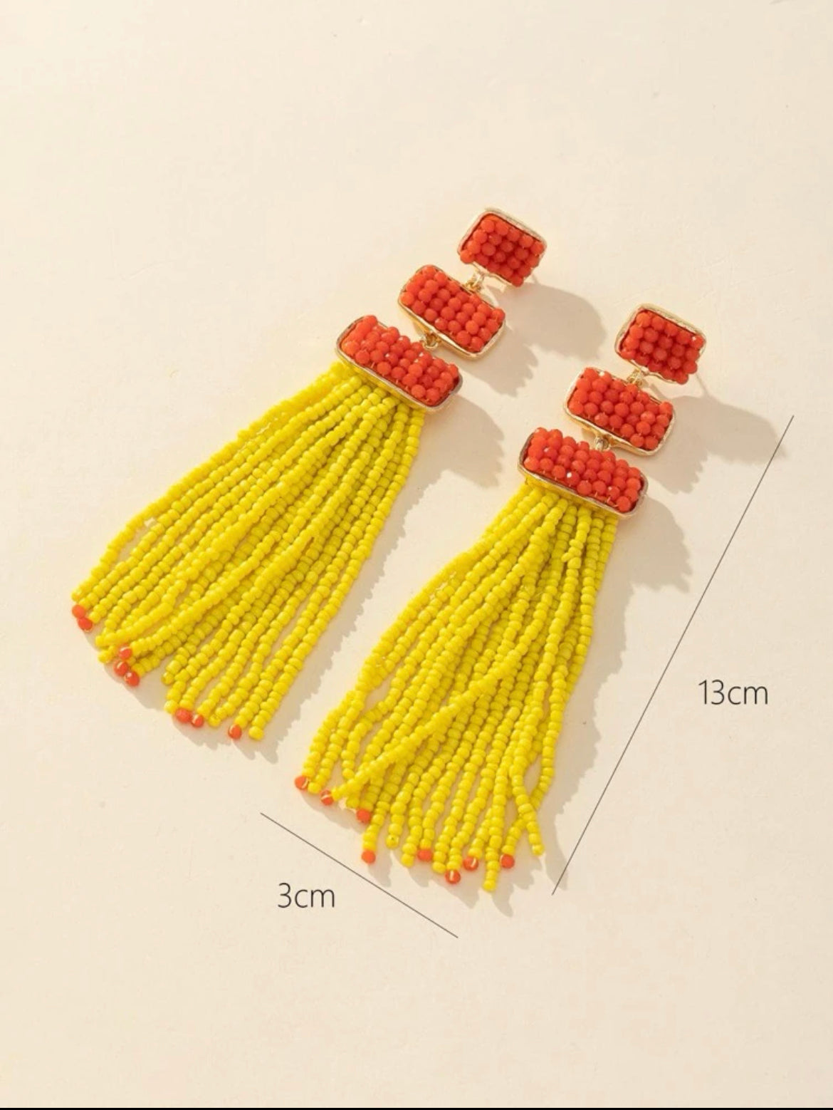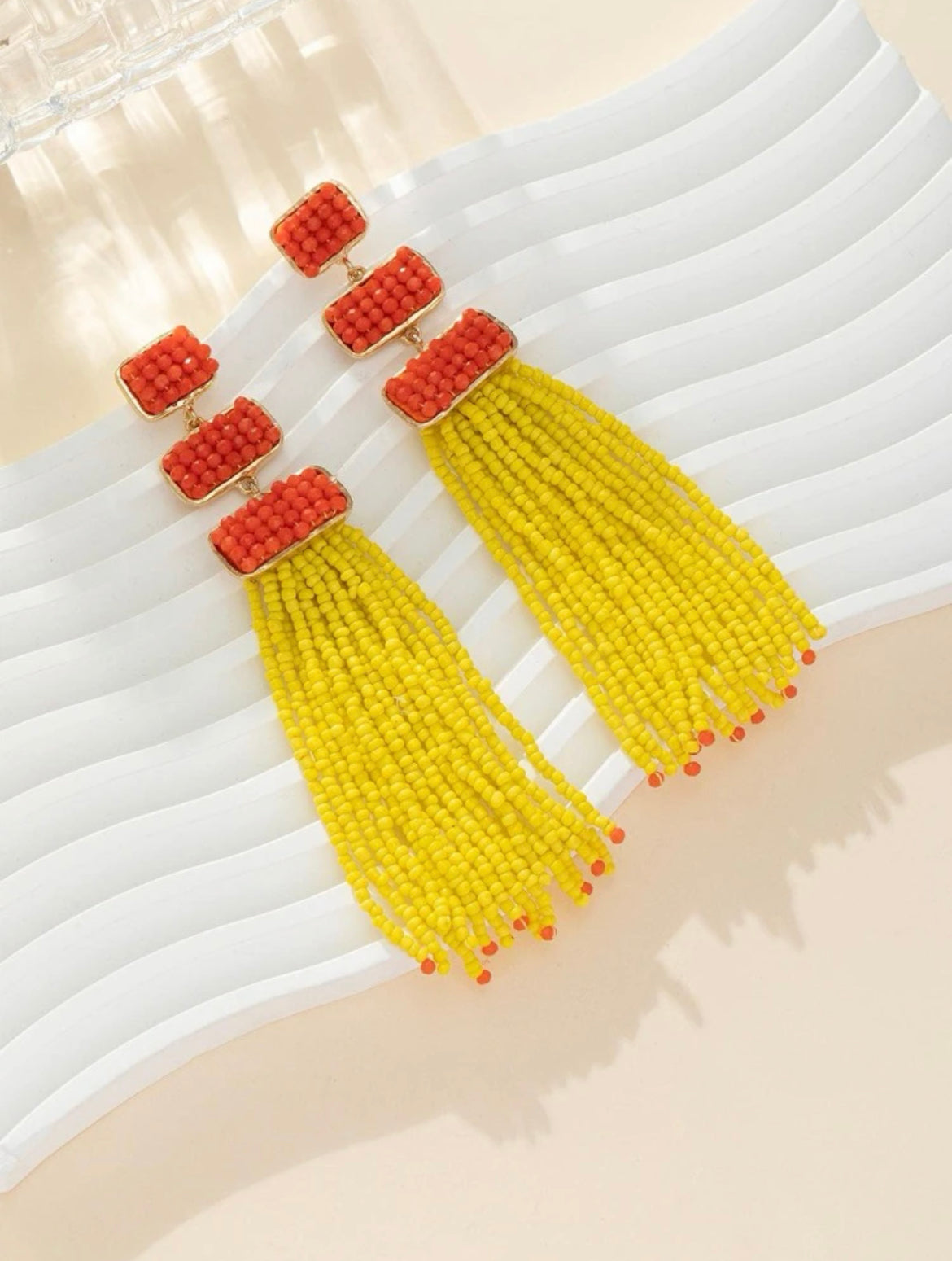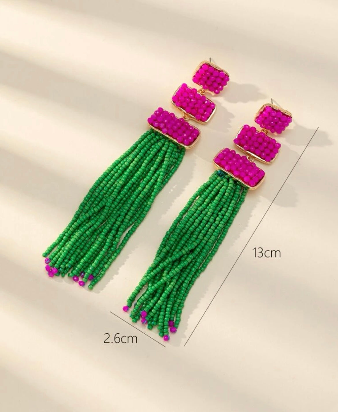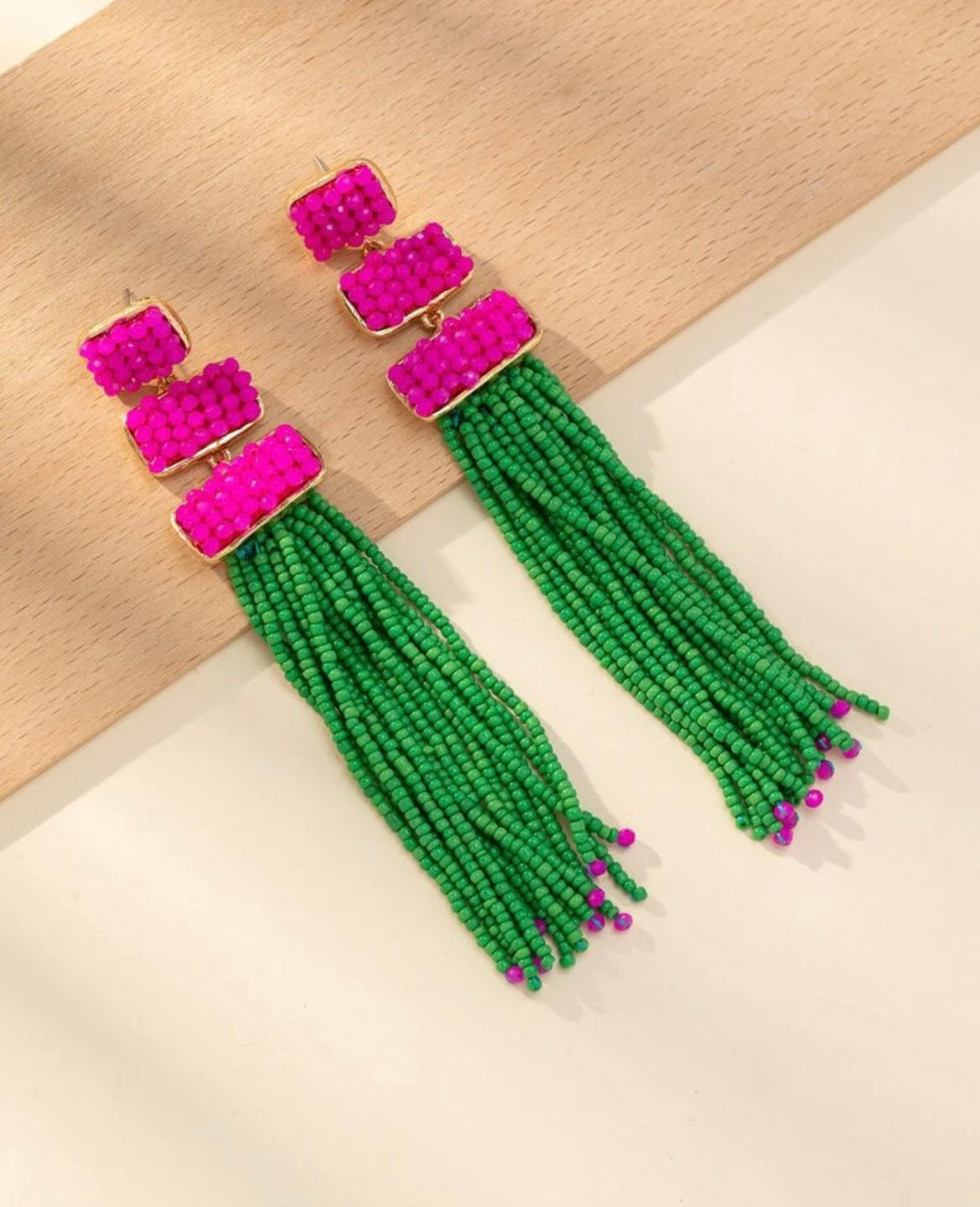 Elegant tassel earrings combining vibrant green threads with glossy pink rectangular accents-bold, artistic flair in every detail.