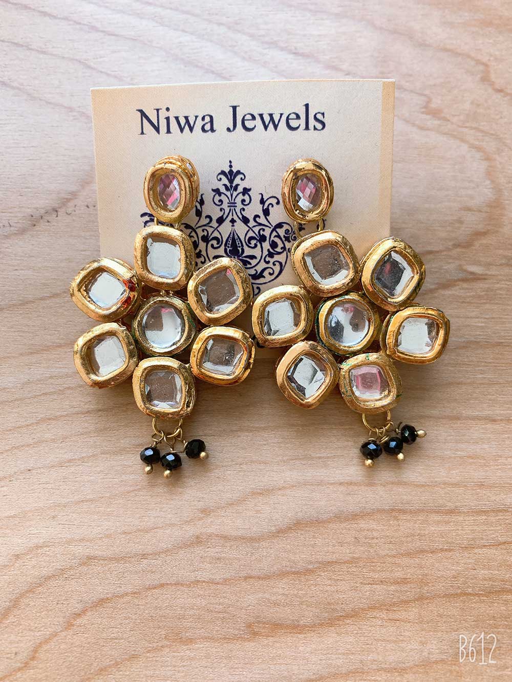 Floral gold earrings with pink and clear gemstones, accented by dangling black beads, offering a perfect blend of charm and sophistication.
