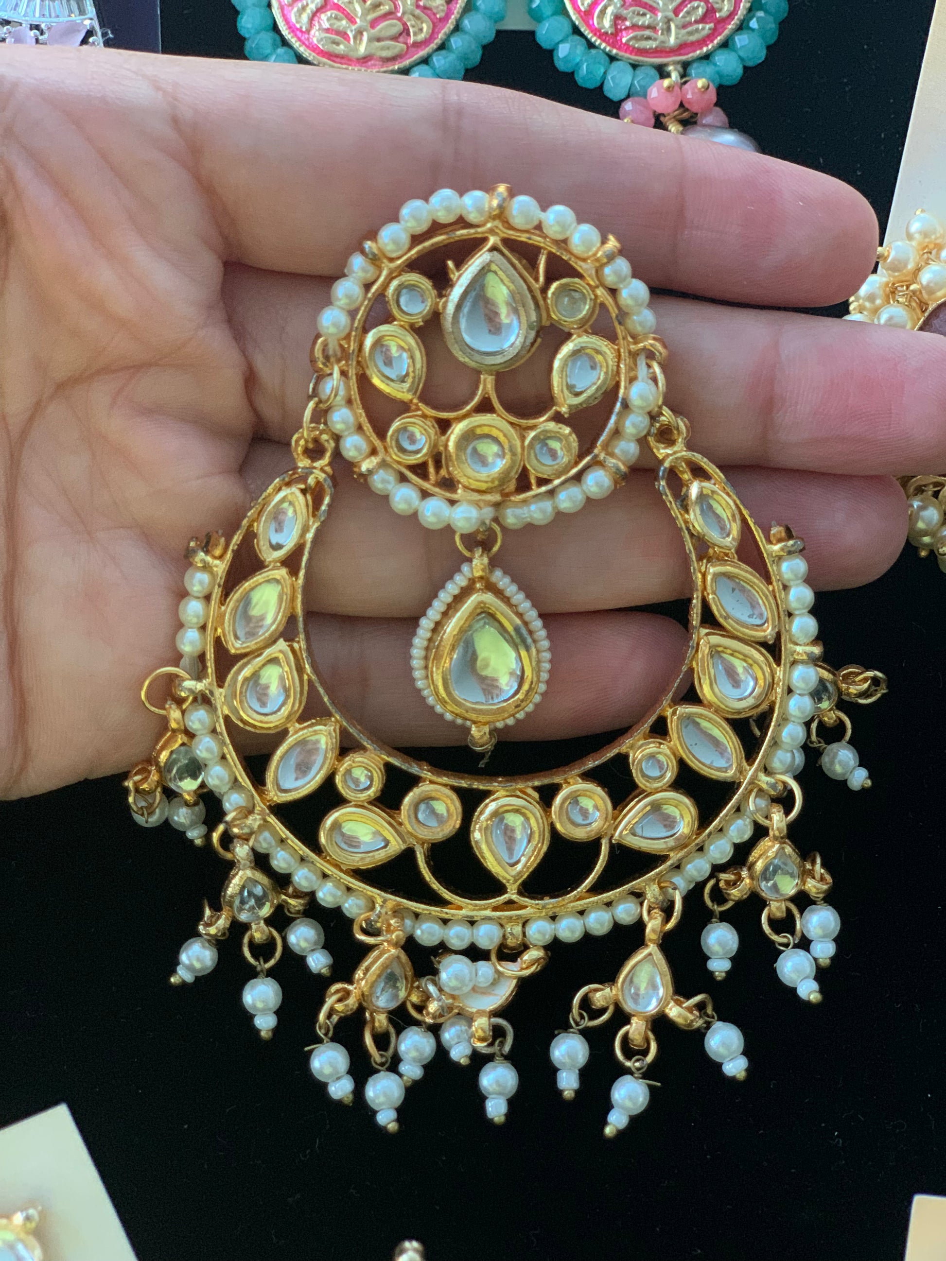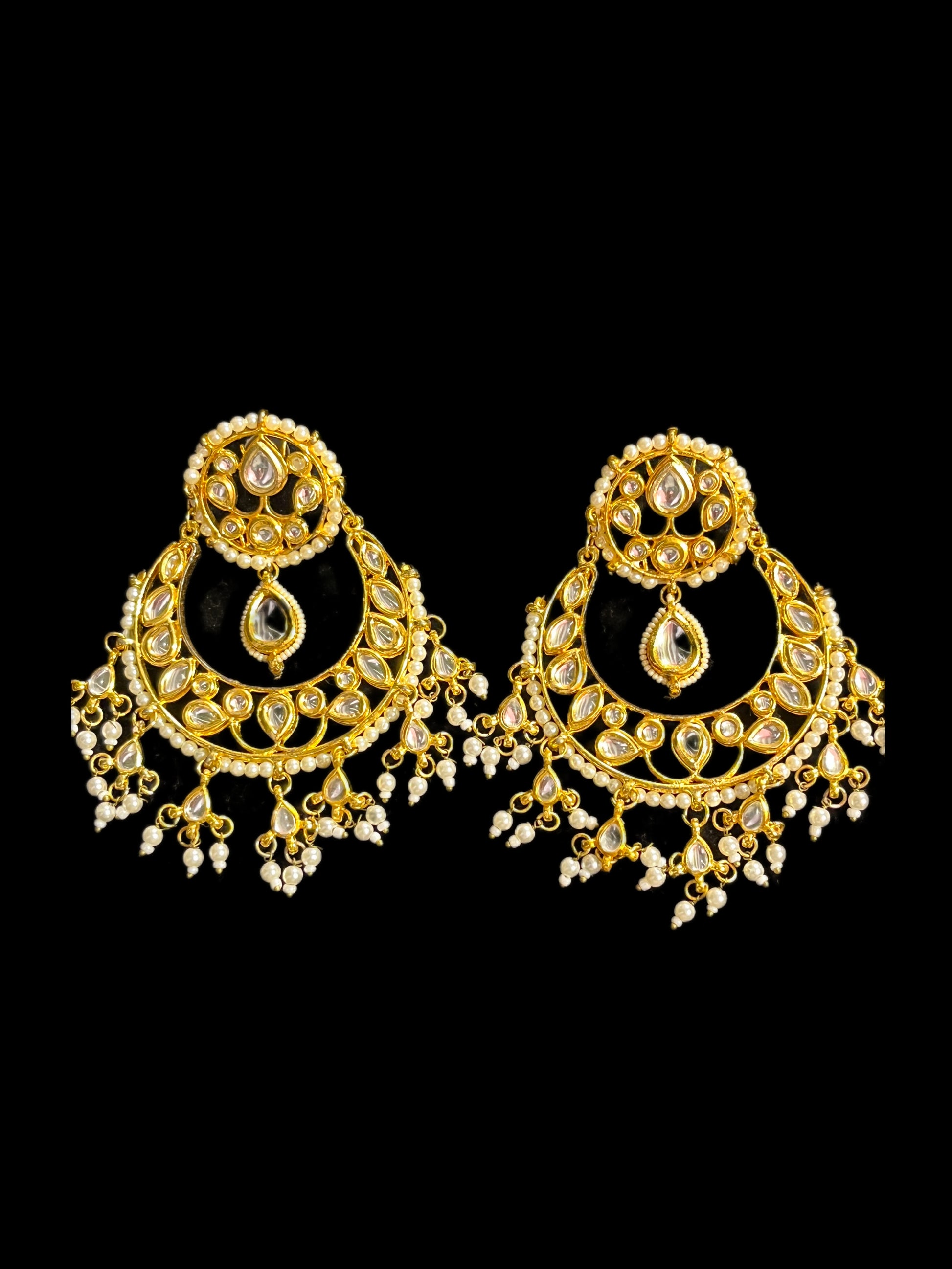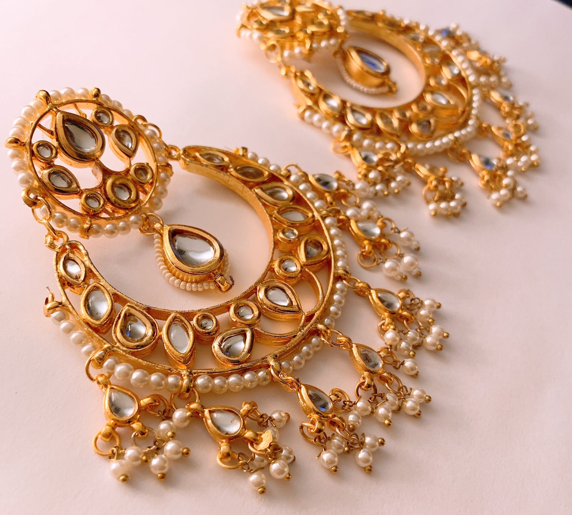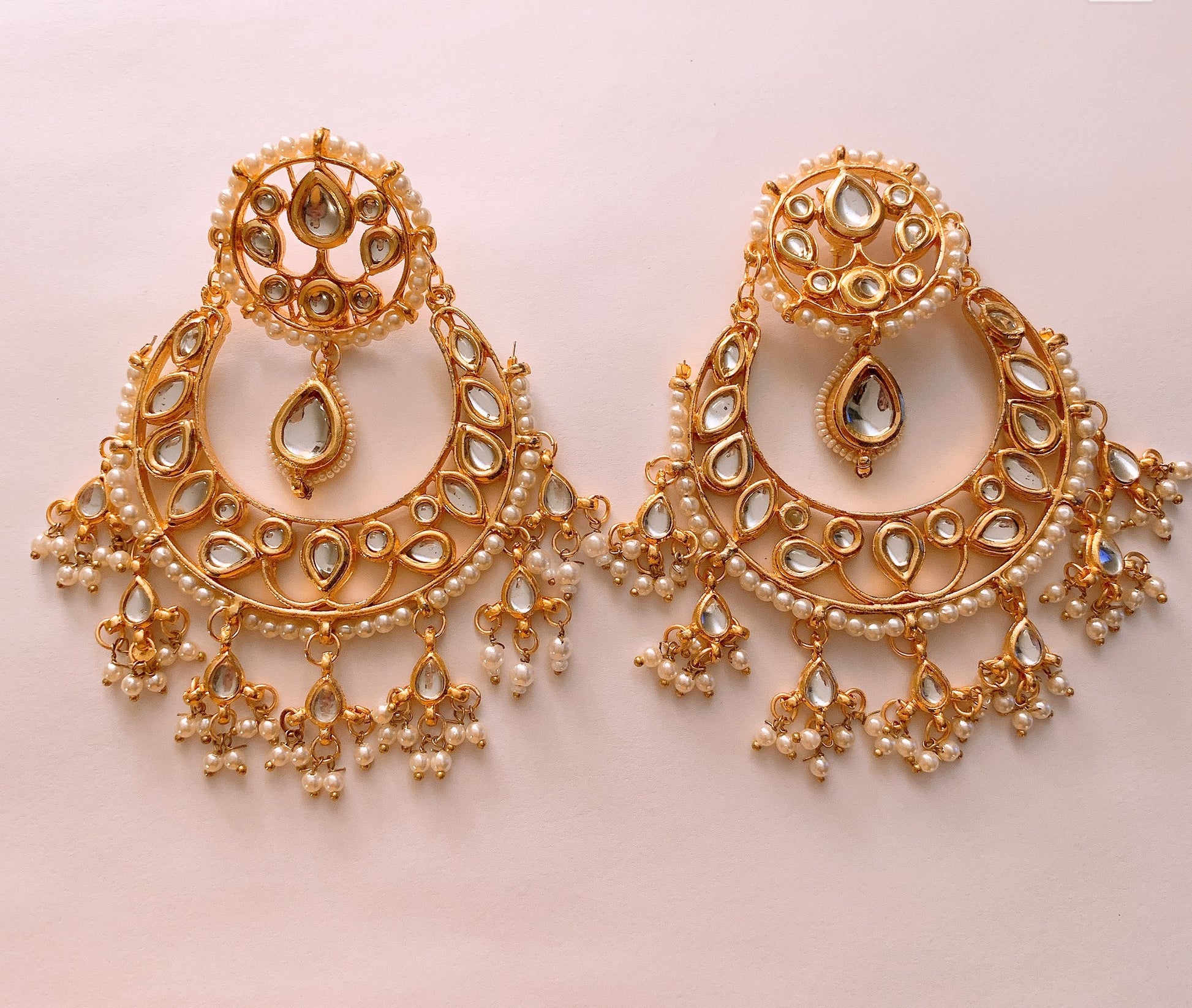 Intricate gold earrings adorned with white stones, featuring circular motifs and teardrop accents, exuding timeless sophistication.