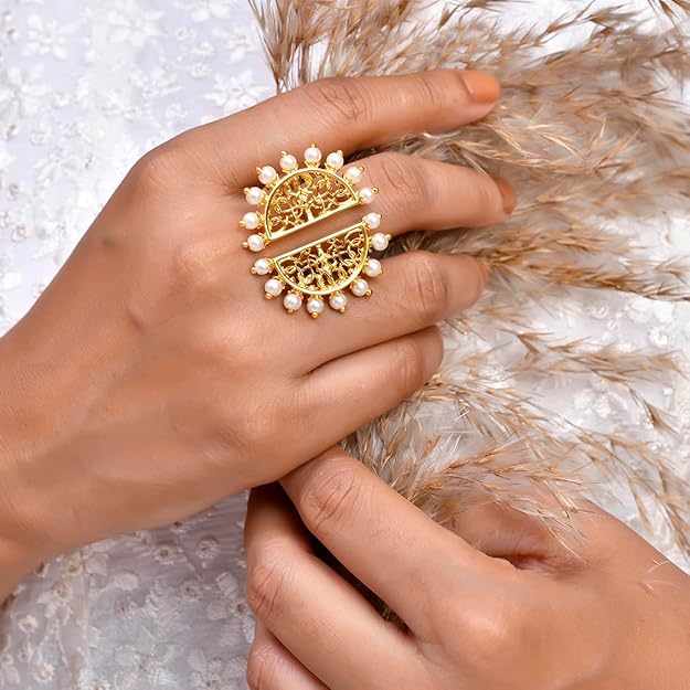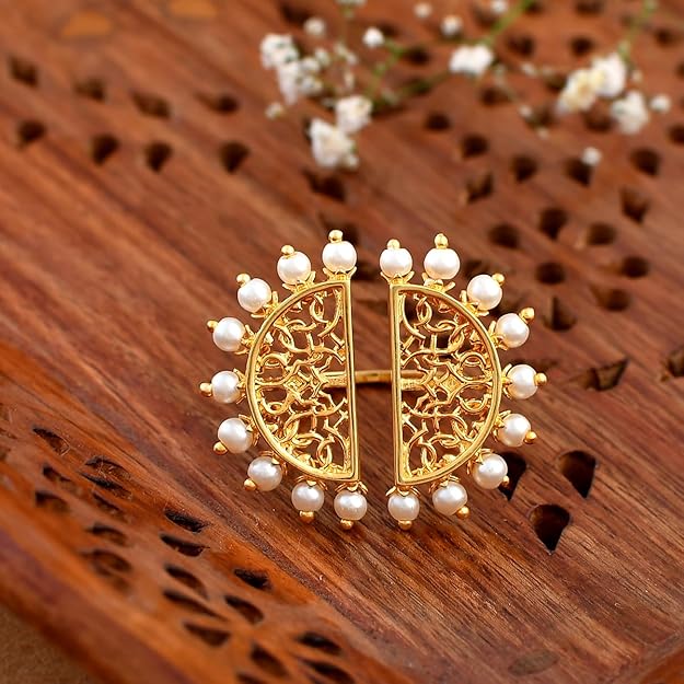 The intricate filigree pattern at the center is bordered by a delicate arrangement of white pearls, resembling the petals of a blooming flower. The contrast of the intricate goldwork and luminous pearls enhances its traditional charm, making it an exquisite accessory for ethnic or festive attire.