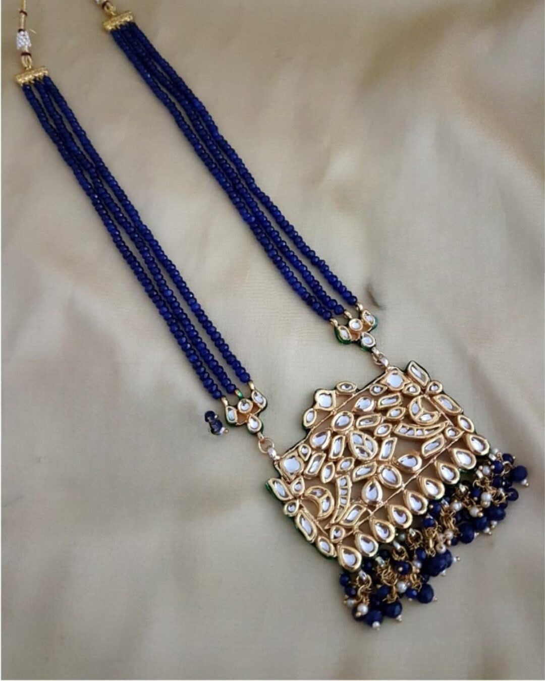A graceful earring with intricate gold work, radiant white stones, and deep blue beads-classic elegance with vibrant charm.