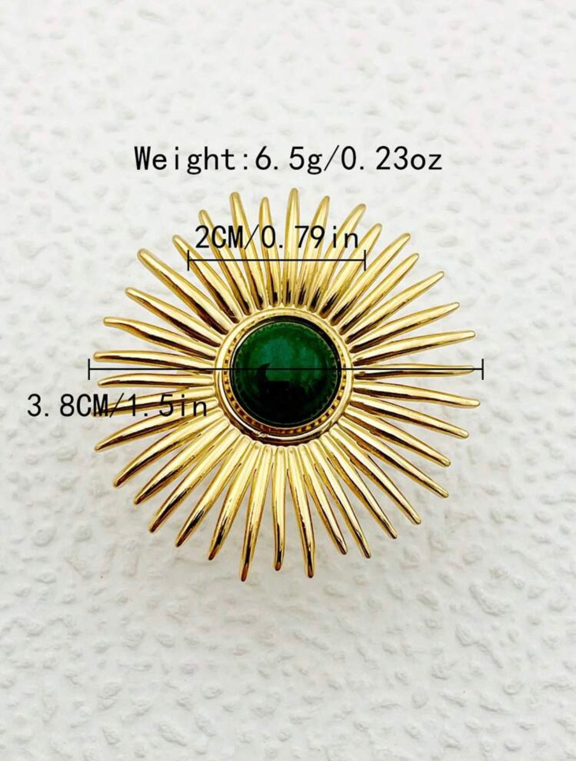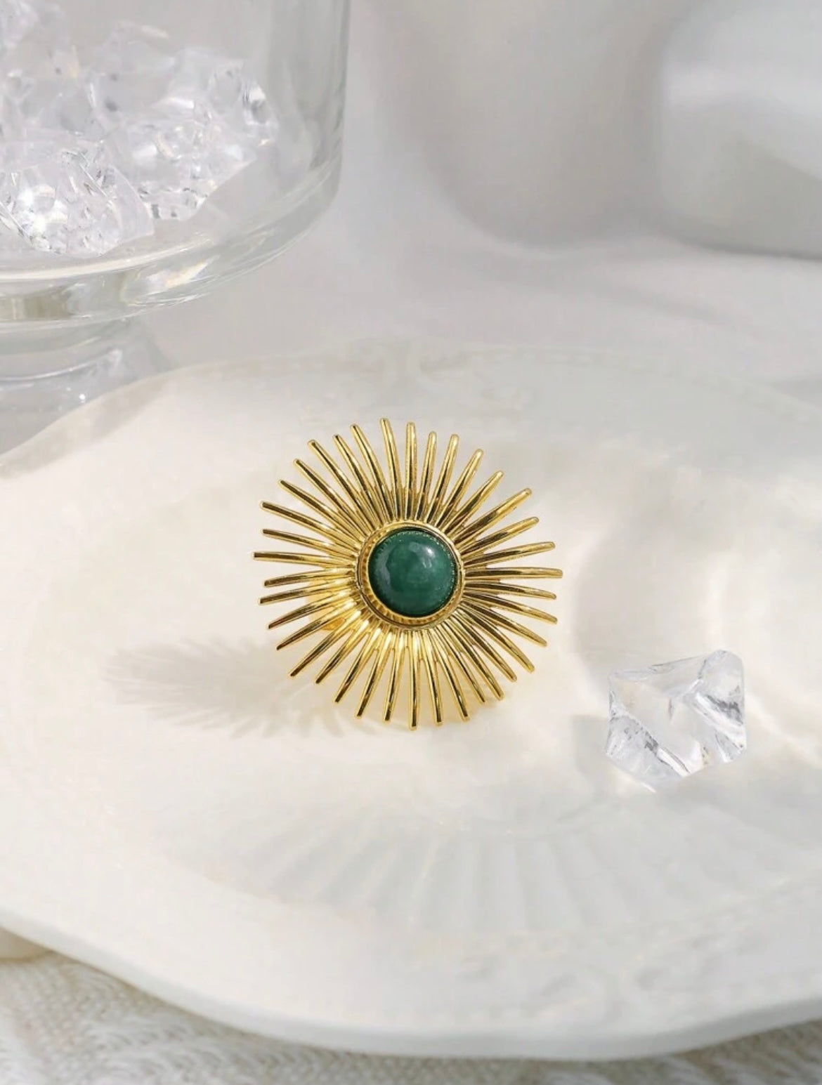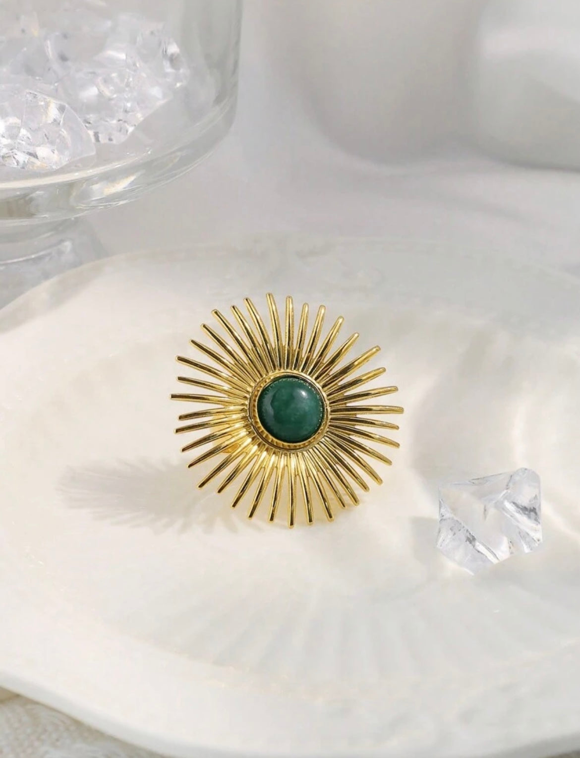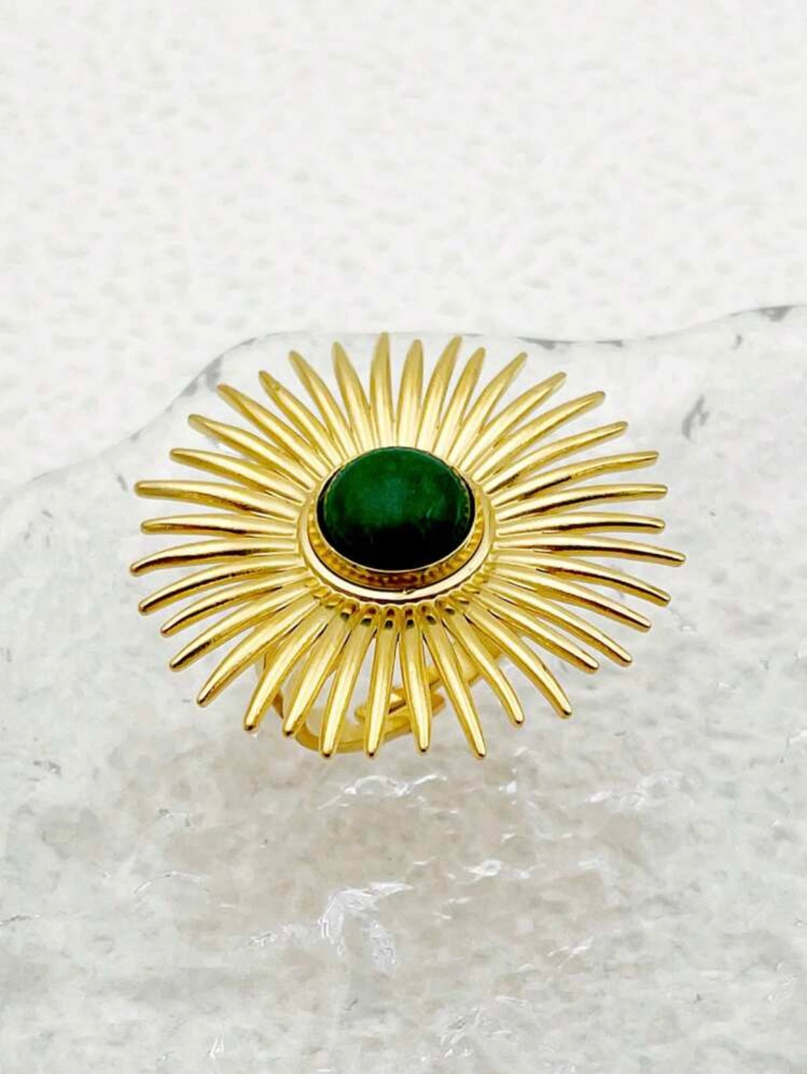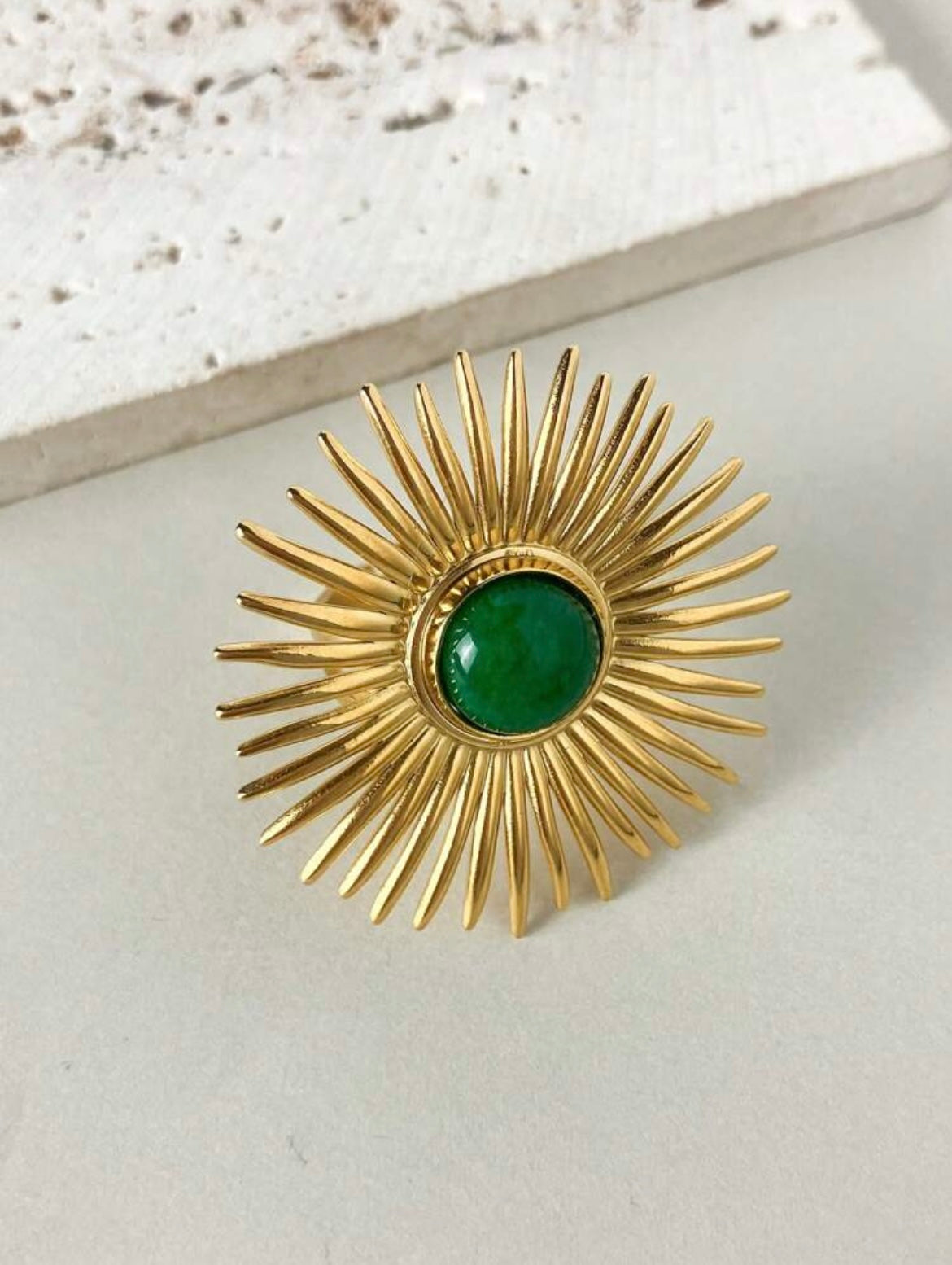 The ring's design is reminiscent brutalist style,with emerald-green stone and made of gold-toned metal.