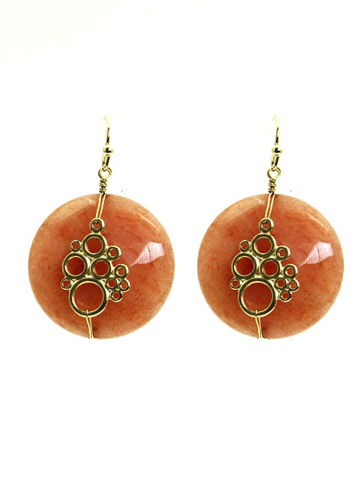 Circular gold earrings featuring a polished peach stone and intricate wirework accented with smaller stones, radiating subtle elegance.