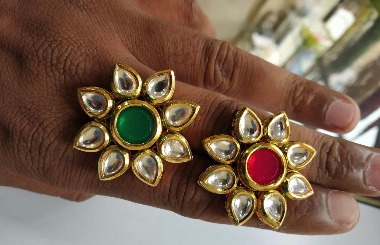 Two floral gold rings featuring vibrant red and green centerstones, encircled by teardrop-shaped clear stones, radiating refined elegance.