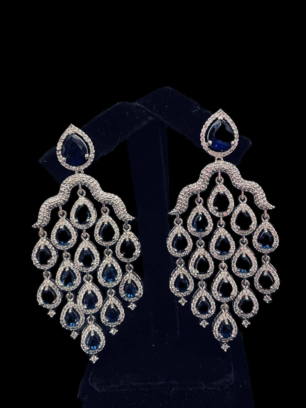 These statement earrings cascade with layers of sparkling teardrop-shaped blue stones framed in shimmering diamonds, exuding regal elegance and graceful movement.