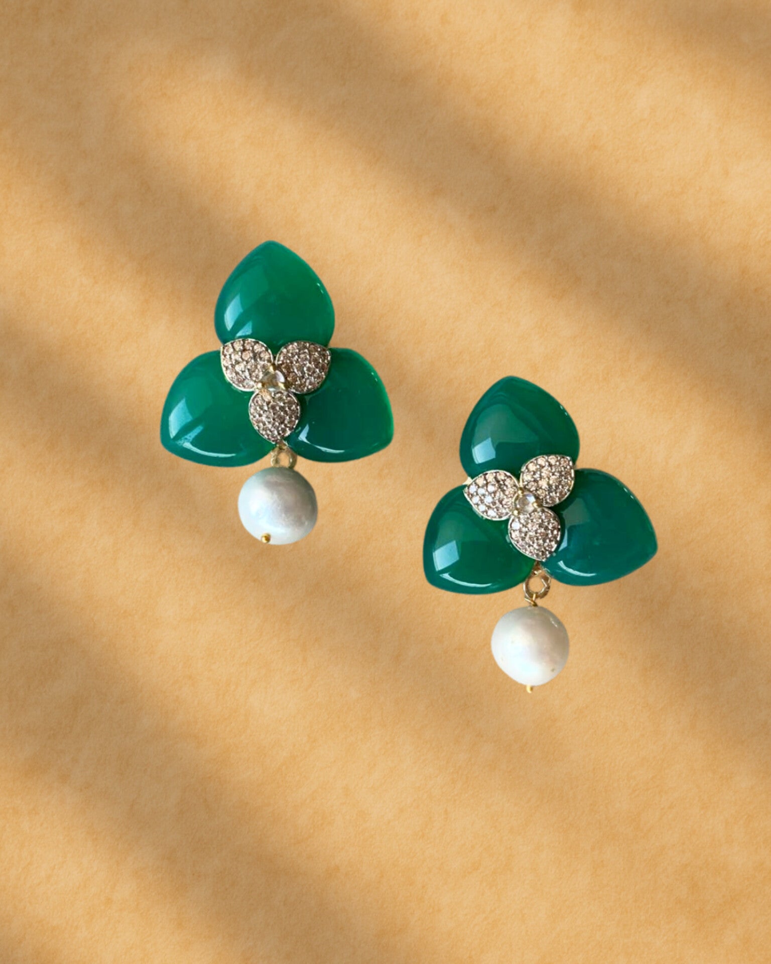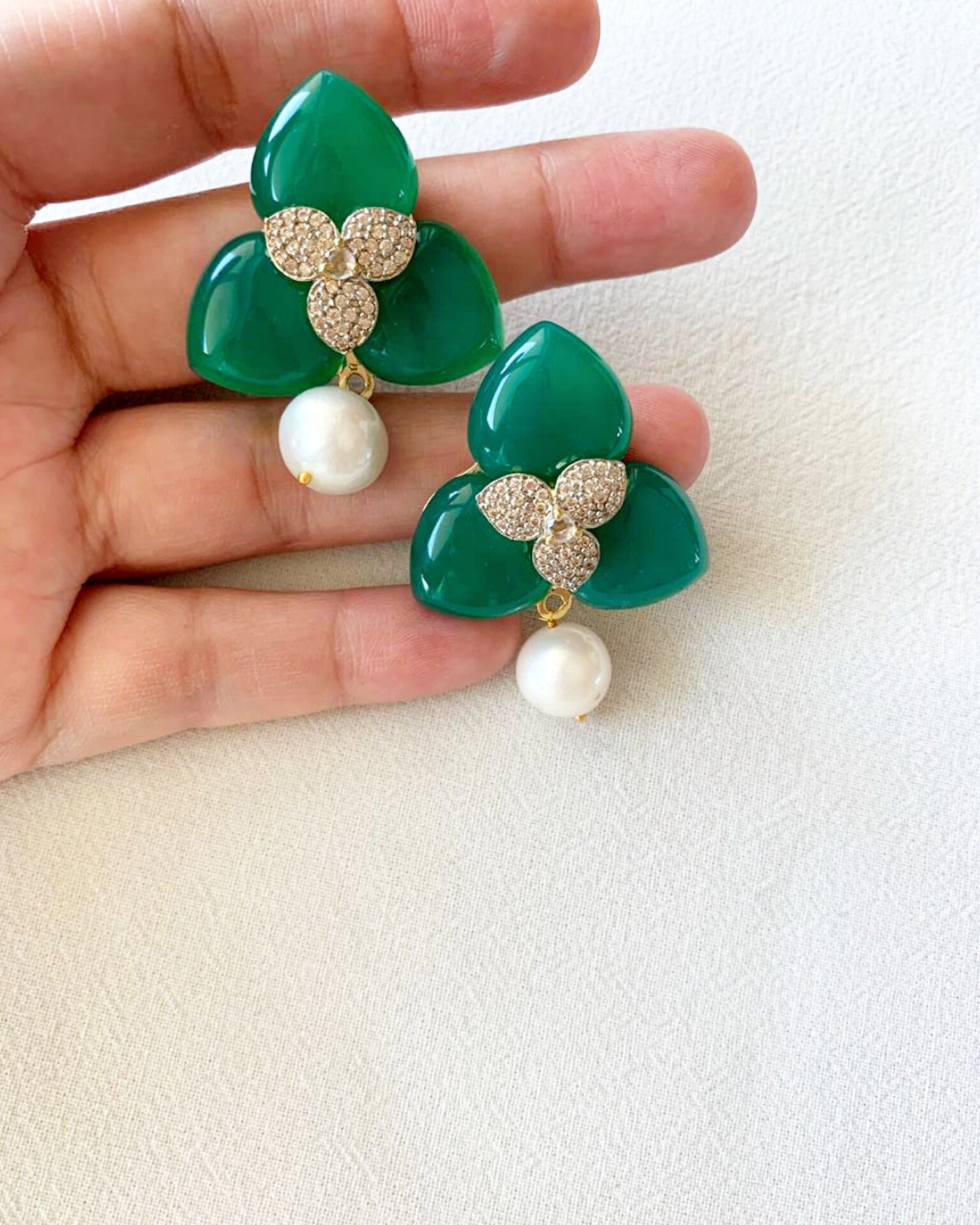 These beautifully crafted heart shaped green quarts earrings with baroque pearl drop. Every piece is curted with high quality semi-precious stones.