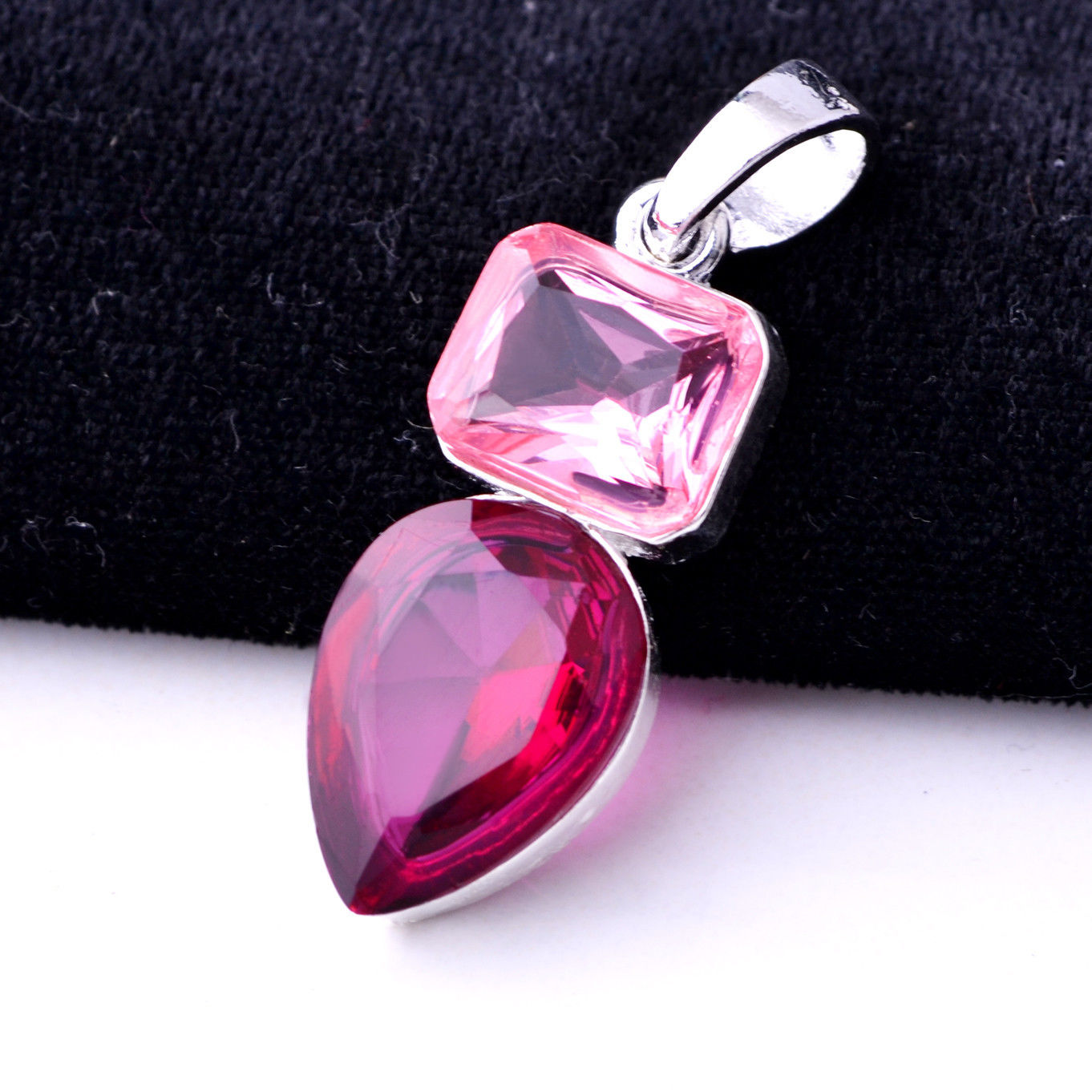 A pendant with a rectangular pink stone and a teardrop-shaped red gem, set in a silver frame-delicate and radiant.
