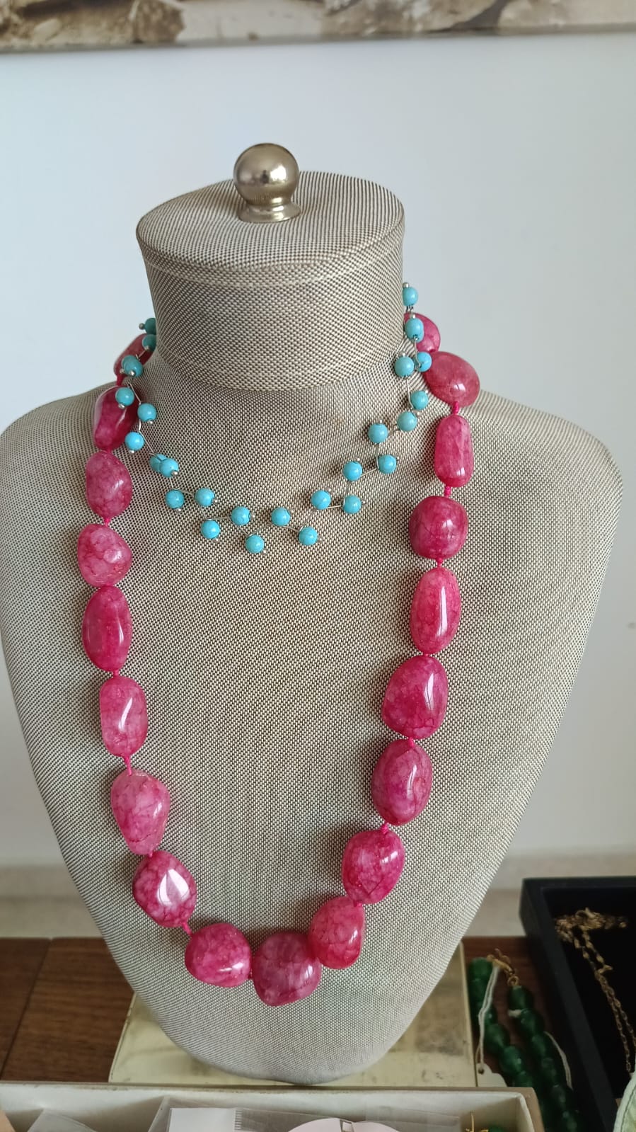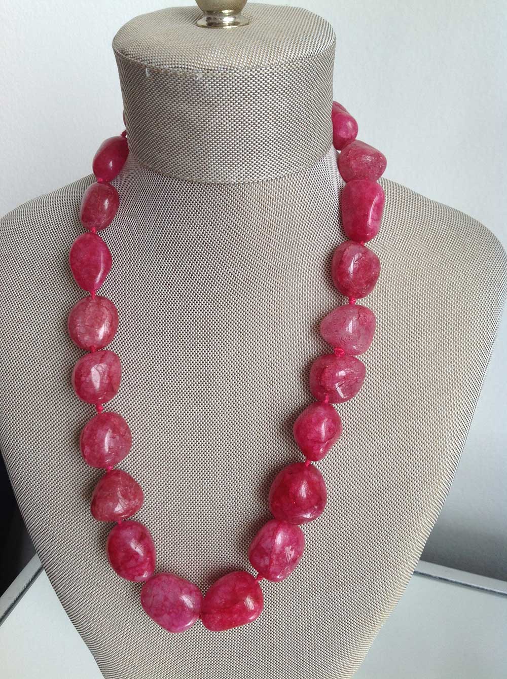 A necklace of polished pink stones with semi-transparent patterns, exuding bold elegance and natural charm.