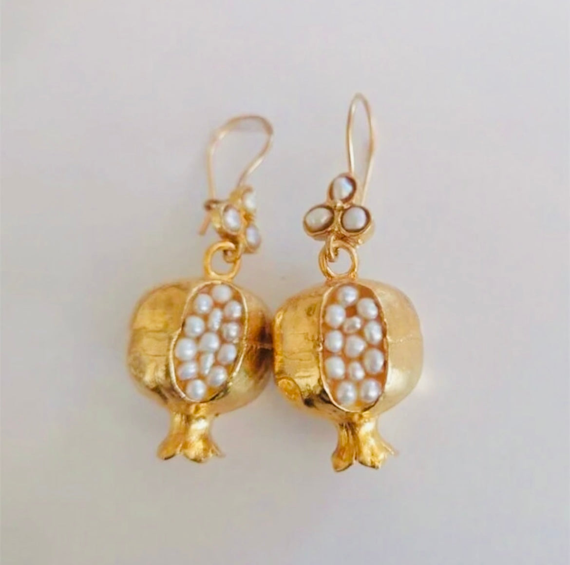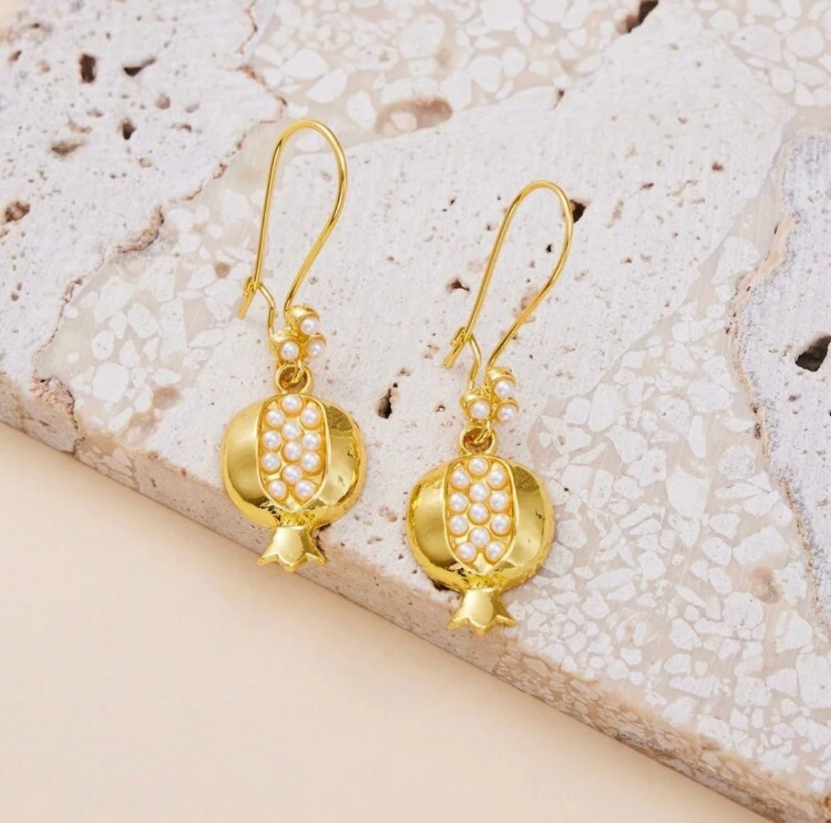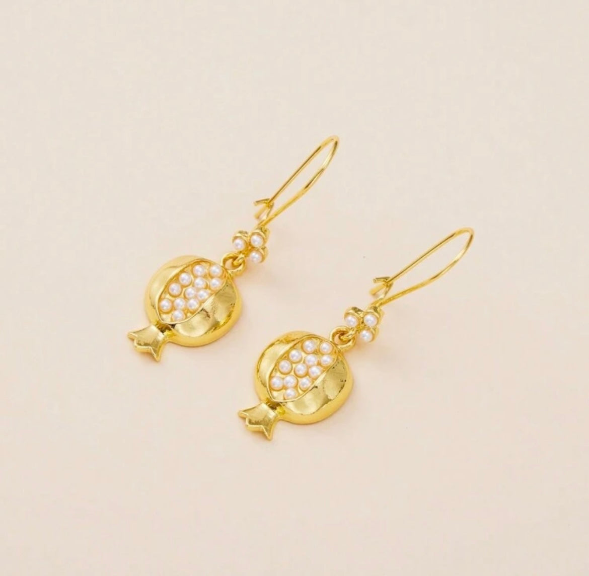 Charming and symbolic, these handcrafted gold-toned earrings are shaped like pomegranates and studded with tiny pearls or ruby red stones, evoking abundance and elegance.