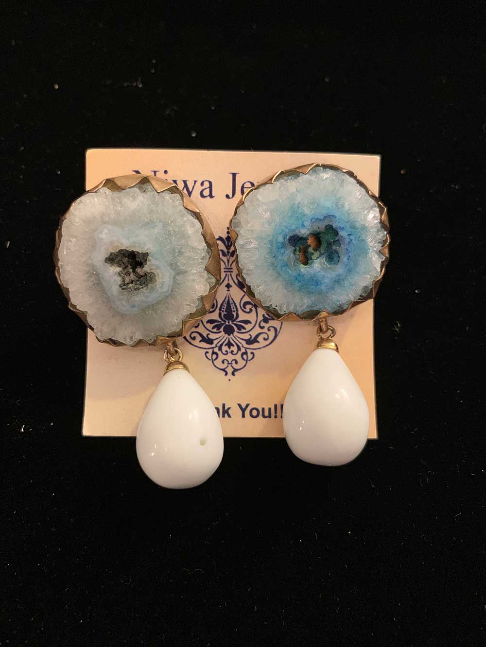 Unique earrings featuring geode slices with crystalline details, paired with smooth white teardrop pendants, blending natural beauty with refined elegance.
