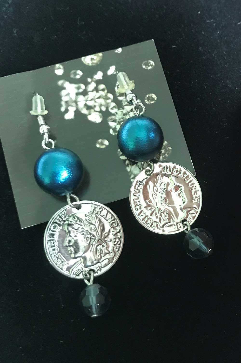 Chic earrings featuring a shimmering blue bead, a silver embossed coin, and a faceted black bead, radiating timeless sophistication.