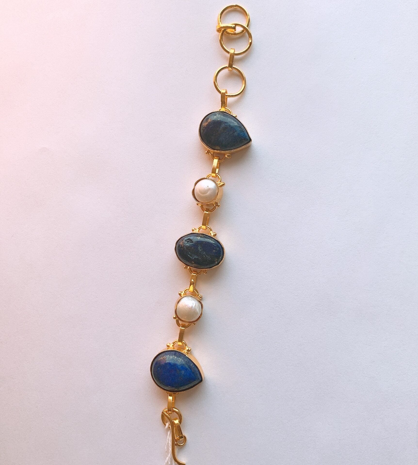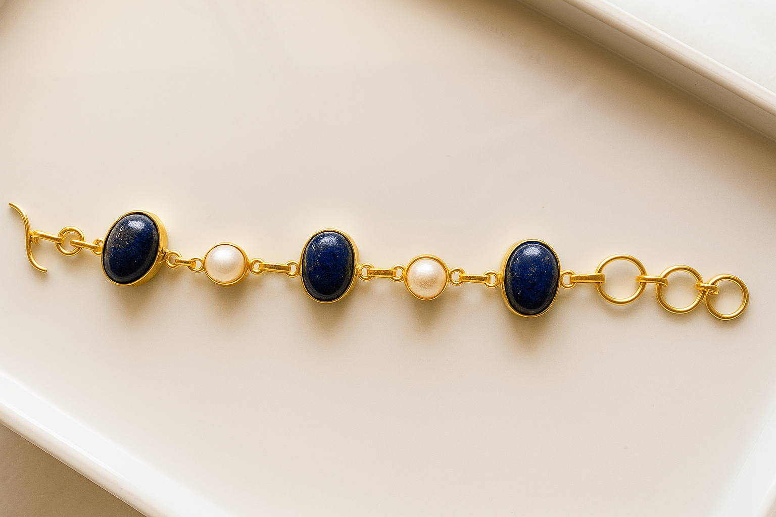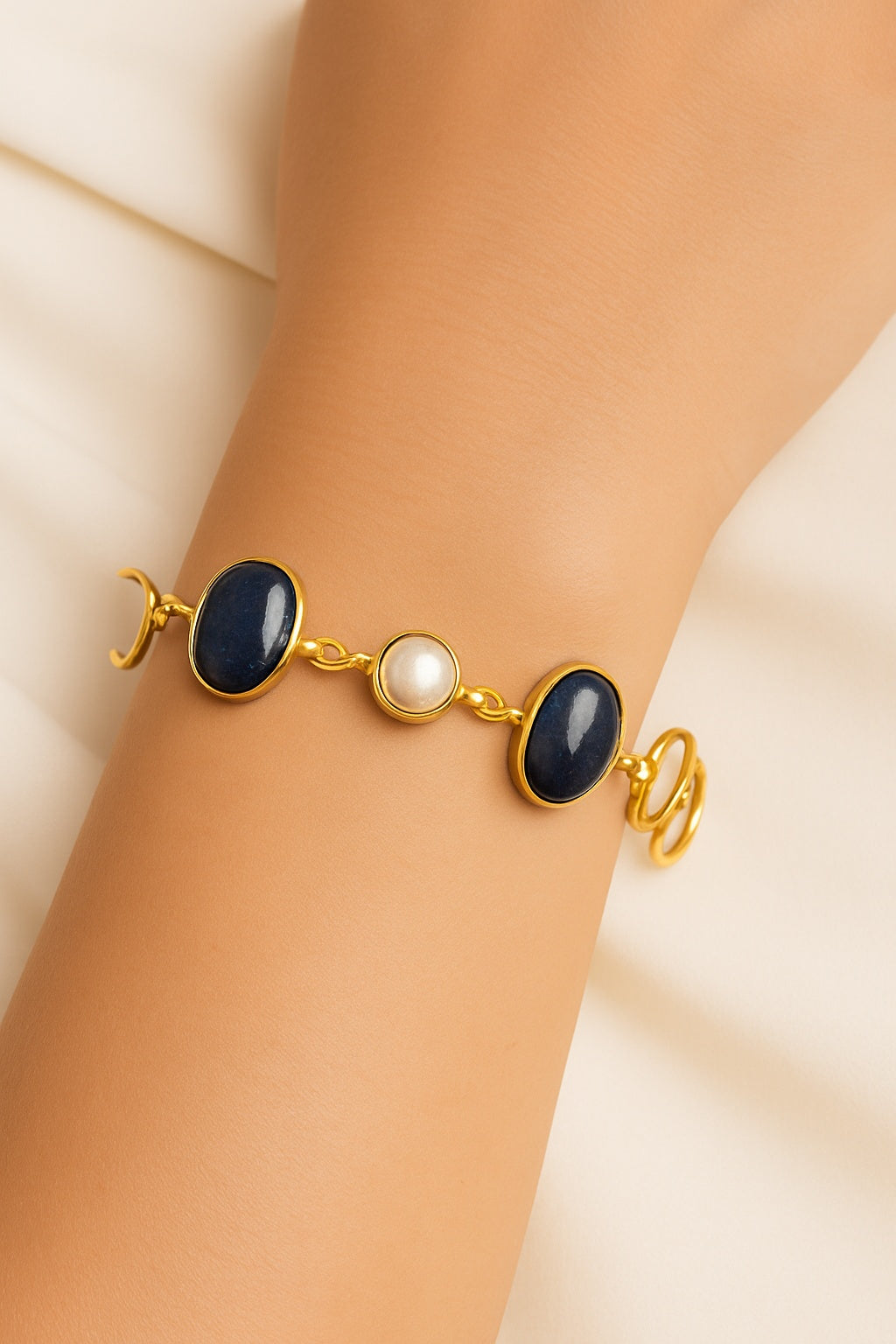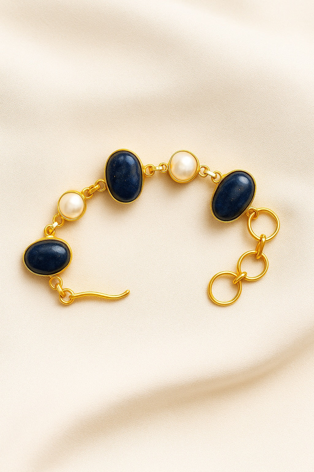 An intricate gold-toned design accented with turquoise beads and a bold black drop, blending elegance and artistry.
