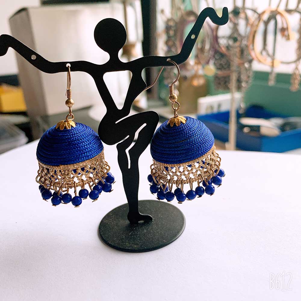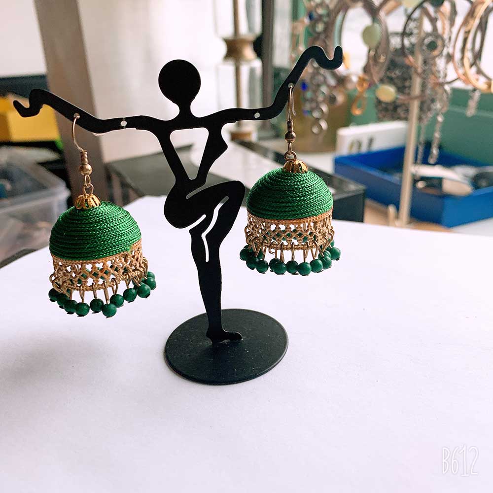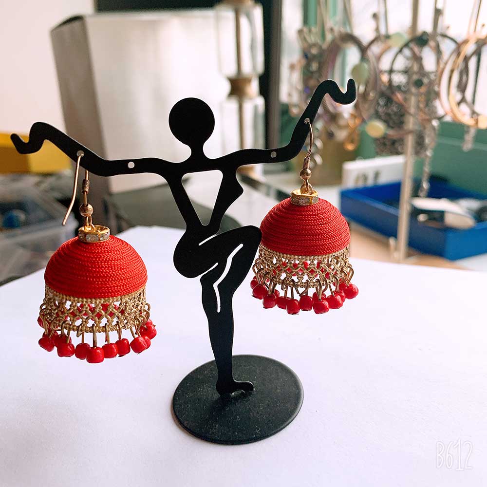 Vibrant red jhumka earrings adorned with golden detailing and red beads, exuding traditional elegance with intricate craftsmanship.