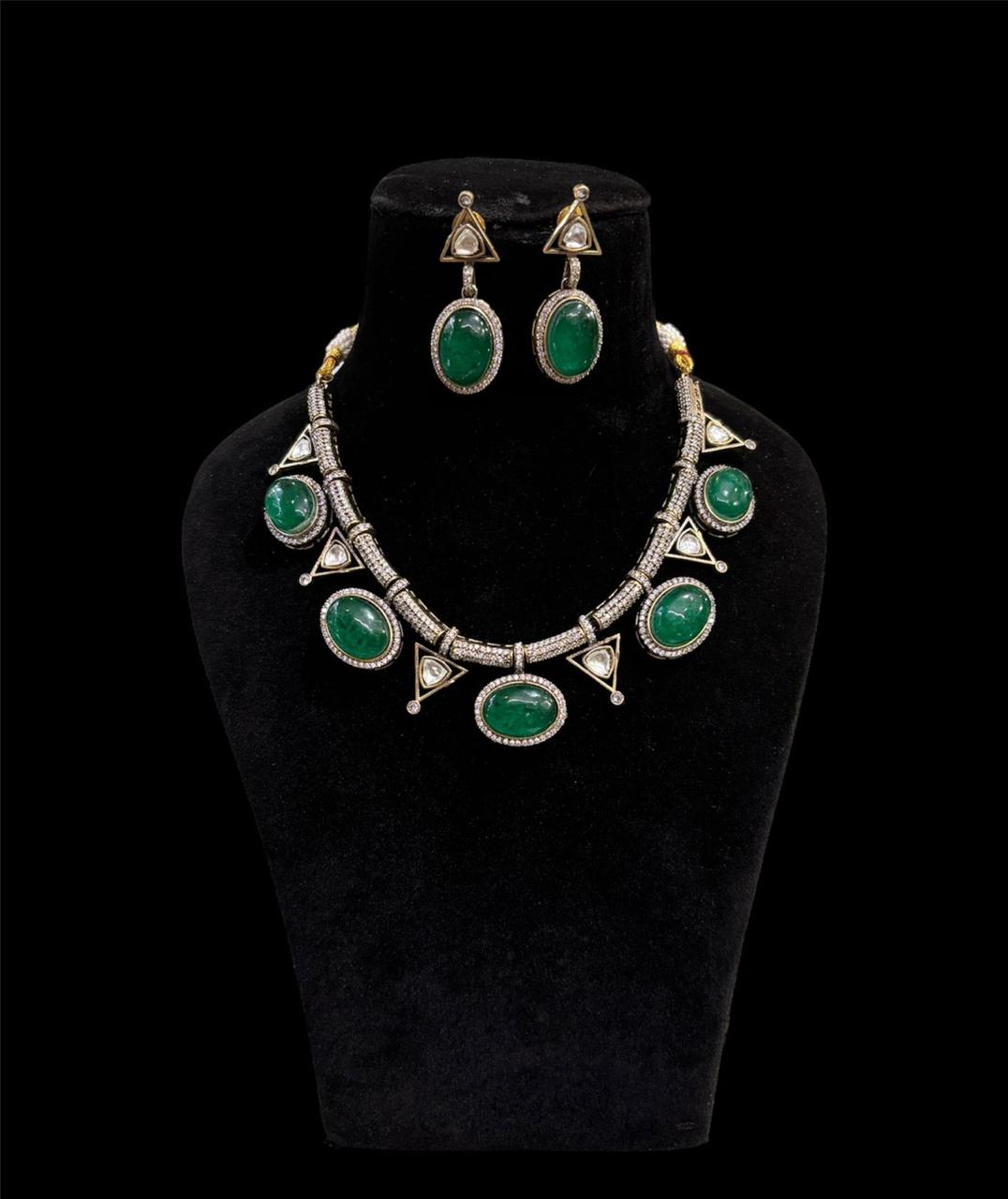 Silver-toned necklace and matching earrings adorned with oval-cut green gemstones, framed by shimmering clear stones-elegant and striking.