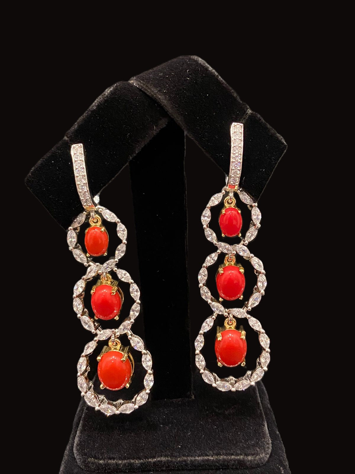 These chandelier marquise zirconia with coral stones in high rhodium finish will elevate any look.