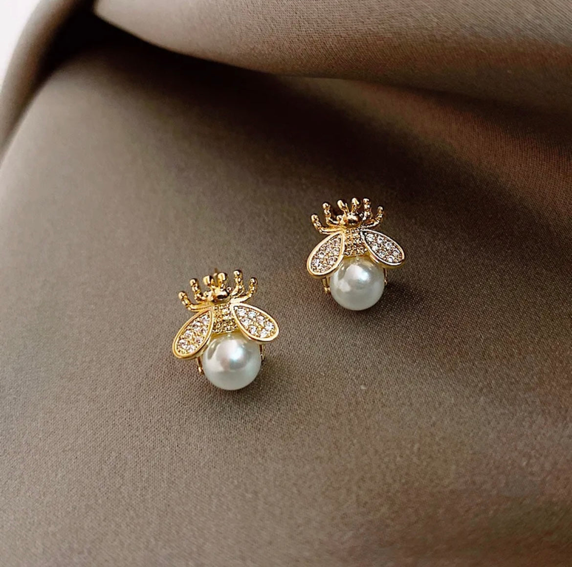 These are bee-shaped studs featuring faux pearls and rhinestones, suitable for daily wear.