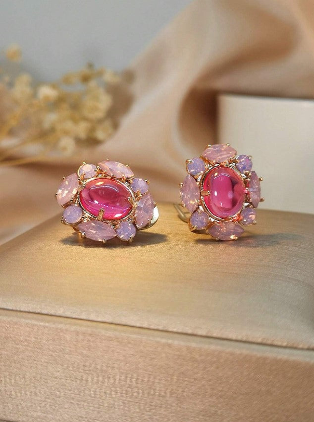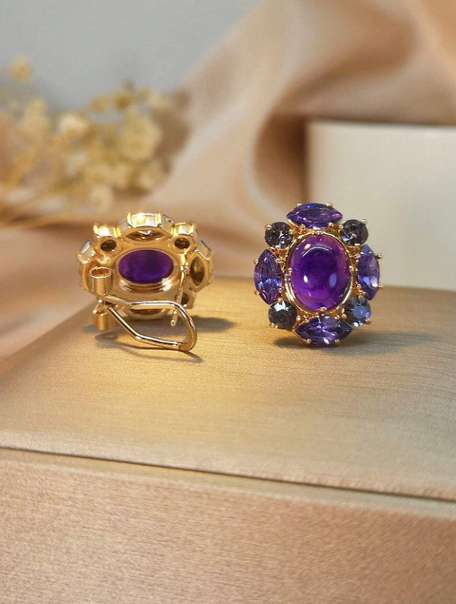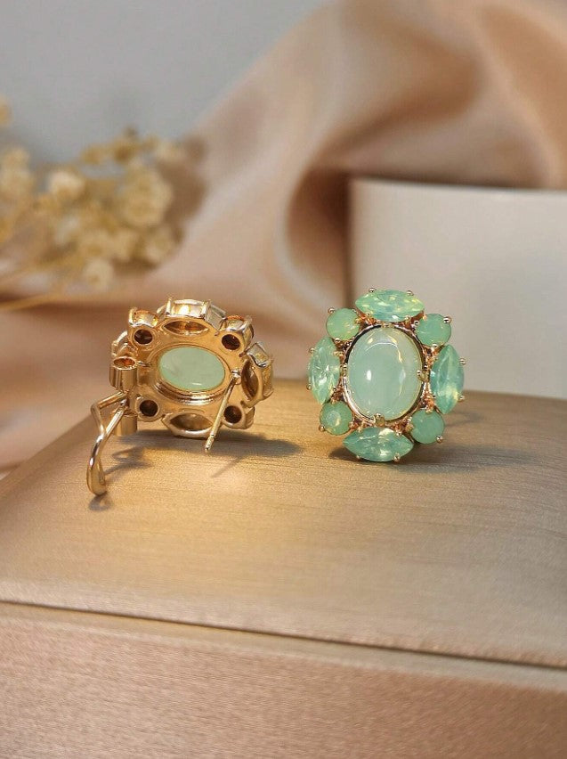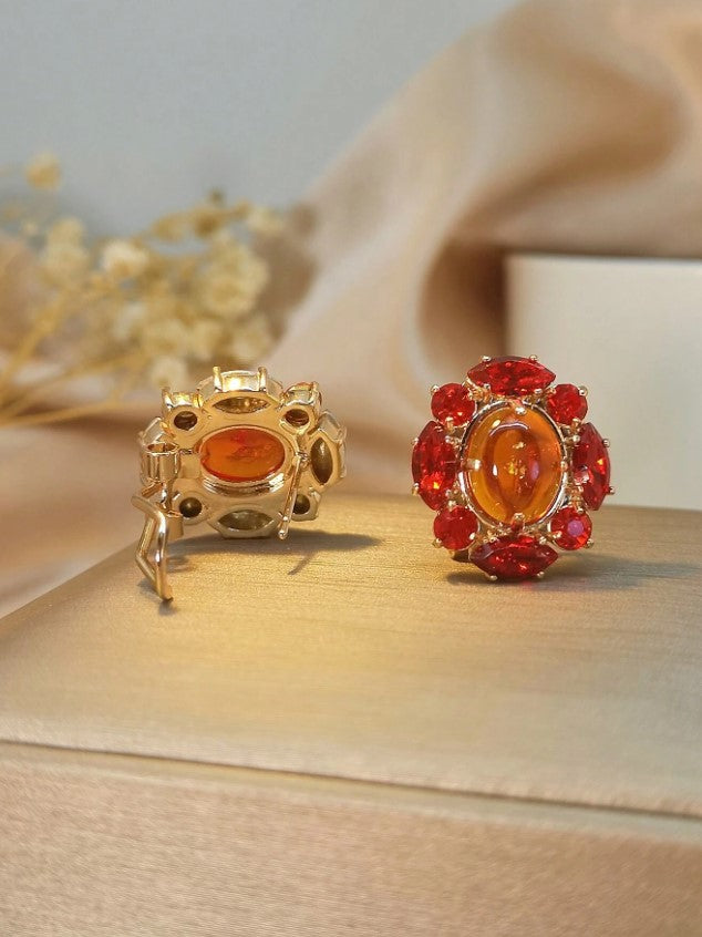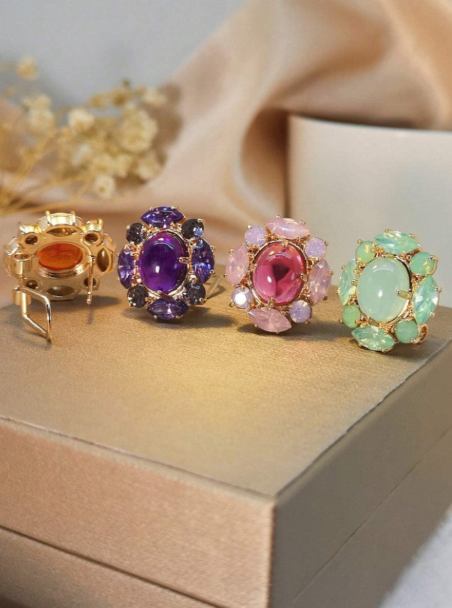Ornate design, oval-shaped stone, silver metal with intricate detailing around stones, eye-catching look.