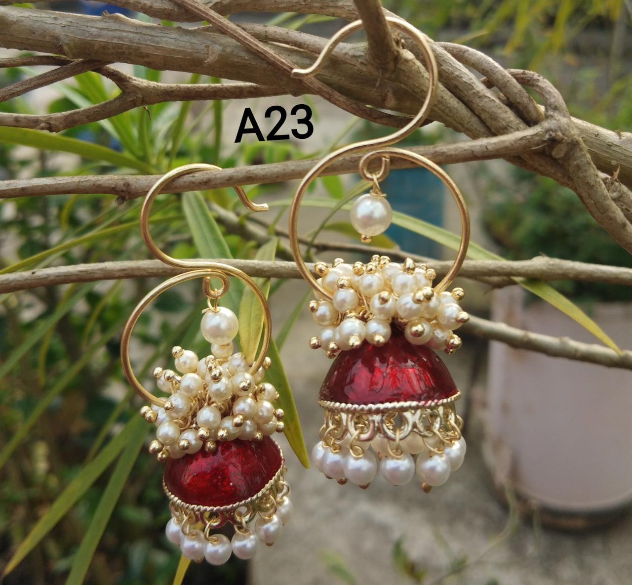 Radiant earrings featuring clusters of delicate pearls paired with a bold red centerpiece, exuding a perfect blend of luxury and elegance.