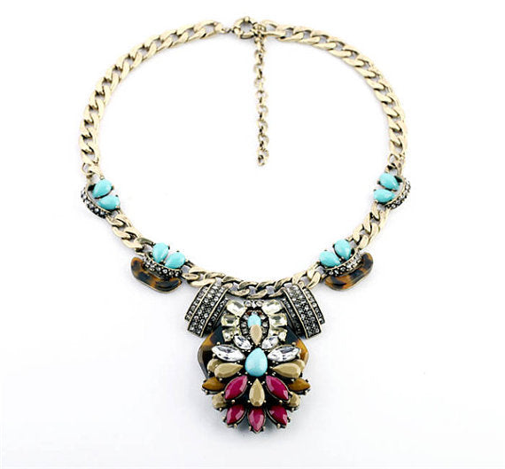A sophisticated necklace featuring a gold-toned chain adorned with turquoise stones, tortoiseshell accents, and a delicate floral pendant, blending vibrant hues with understated elegance.