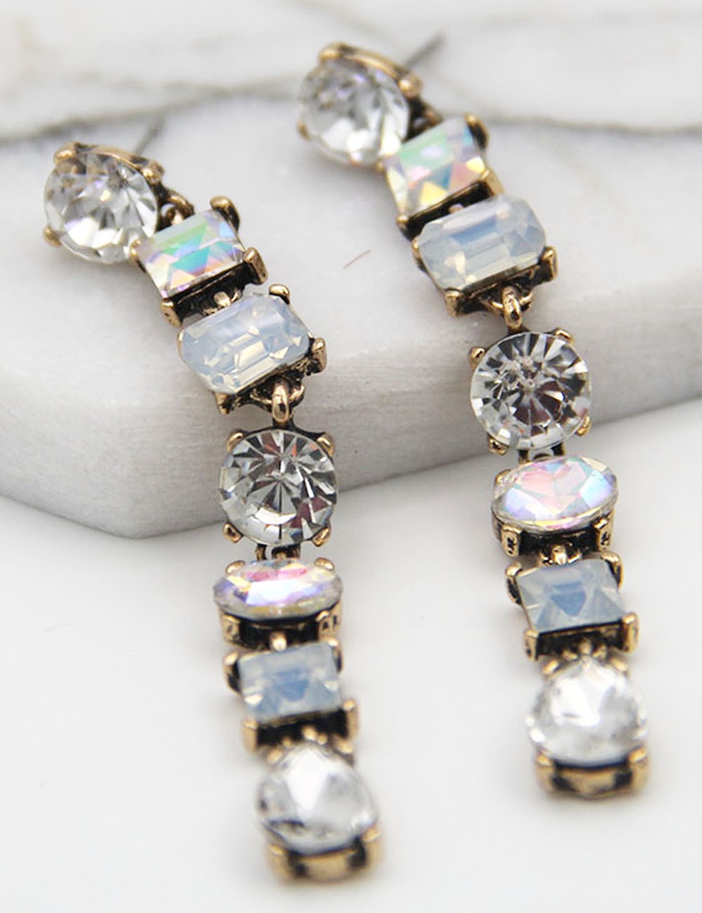 Elegant earrings with alternating clear and iridescent gemstones, arranged vertically in round and square shapes, set in gold-tone metal for a sophisticated touch.