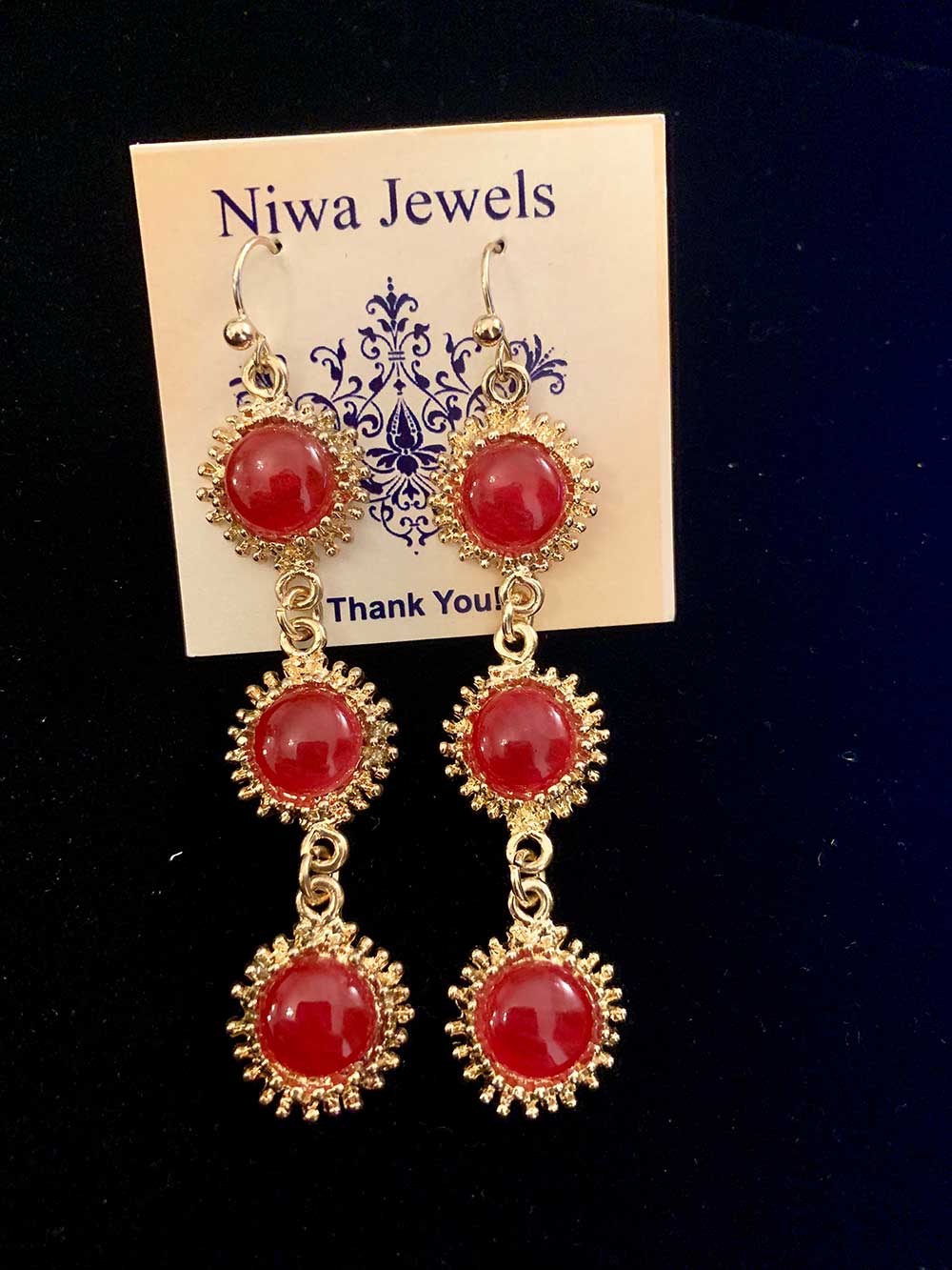 Gold earrings with three radiant red gemstones linked in a graceful, dangling design, exuding timeless elegance.