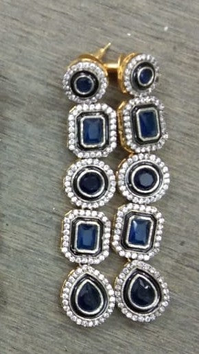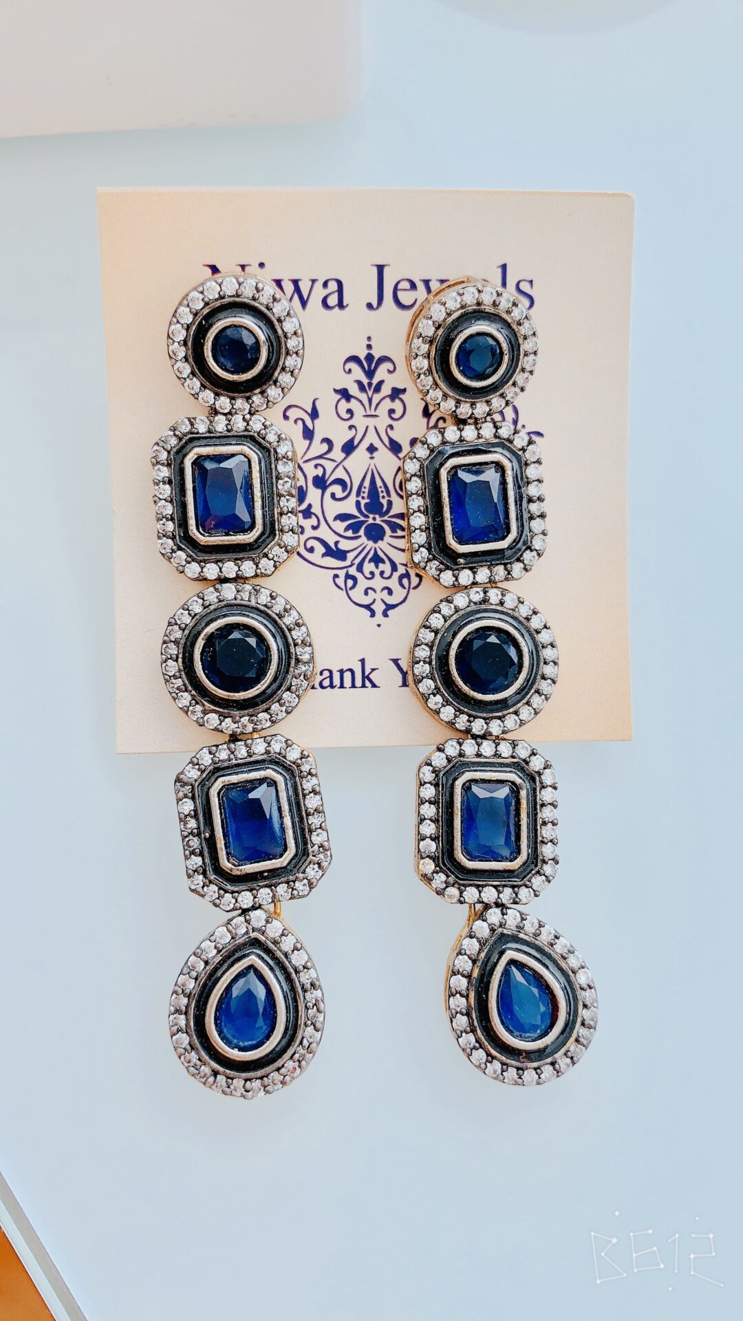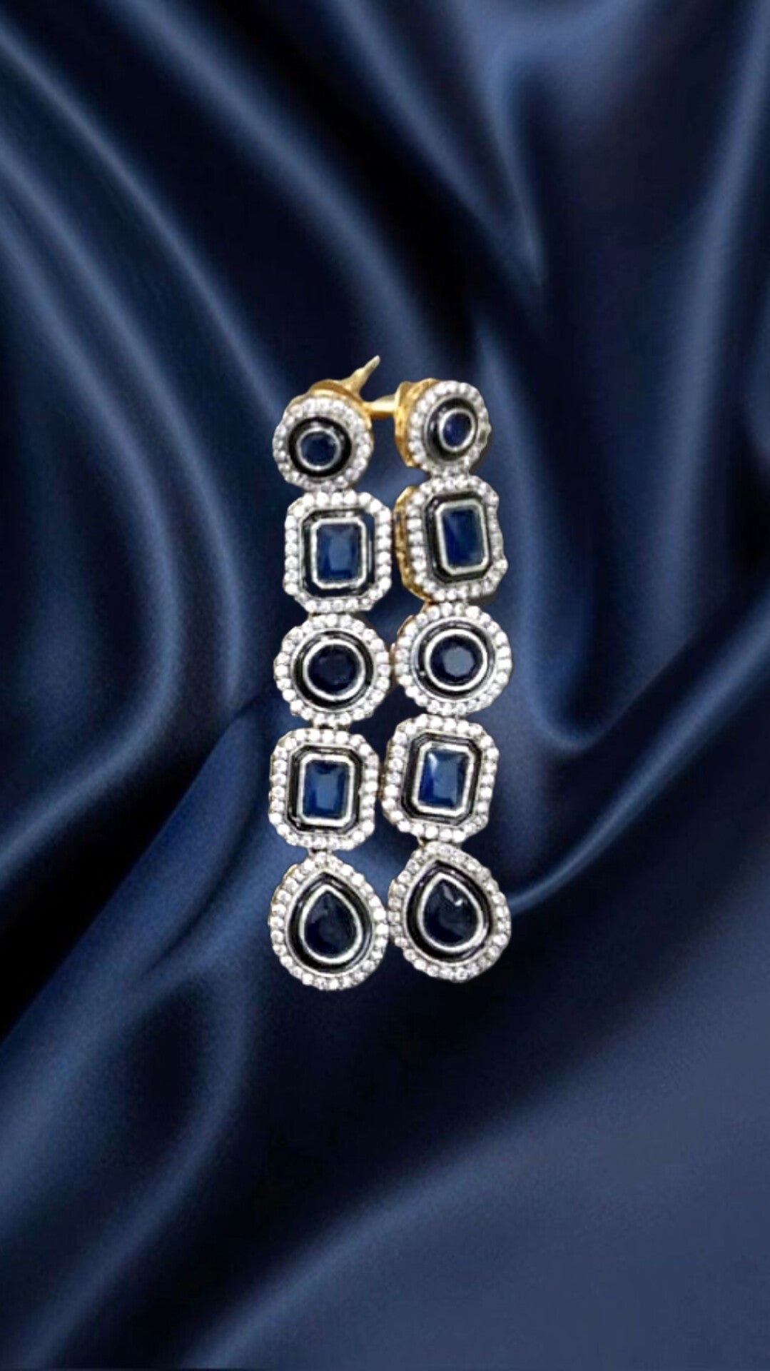 A captivating blend of classic elegance and modern sparkle, these long drop earrings feature deep navy stones framed in shimmering white crystals. With a striking mix of round, square, and teardrop shapes, they bring a bold sophistication to any occasion.