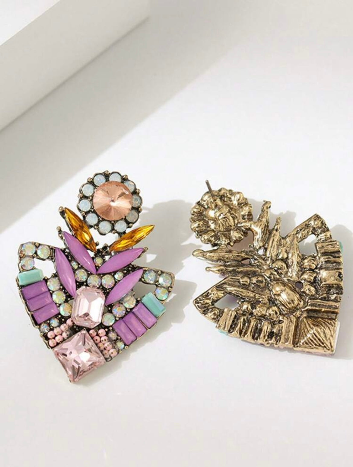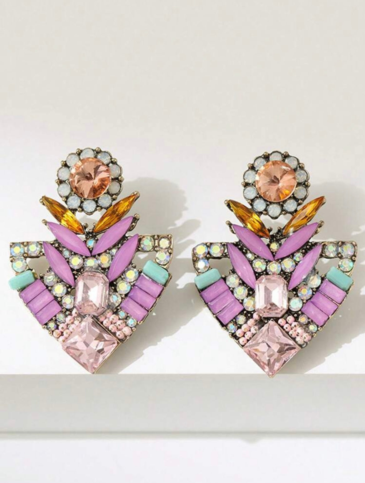 The earrings are described as ornate triangle crystal earrings,round rhinestone at the top, inverted triangle design.