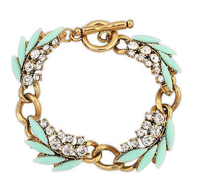 A delicate gold-tone bracelet adorned with pink enamel leaves and sparkling rhinestone clusters, radiating elegance and charm.