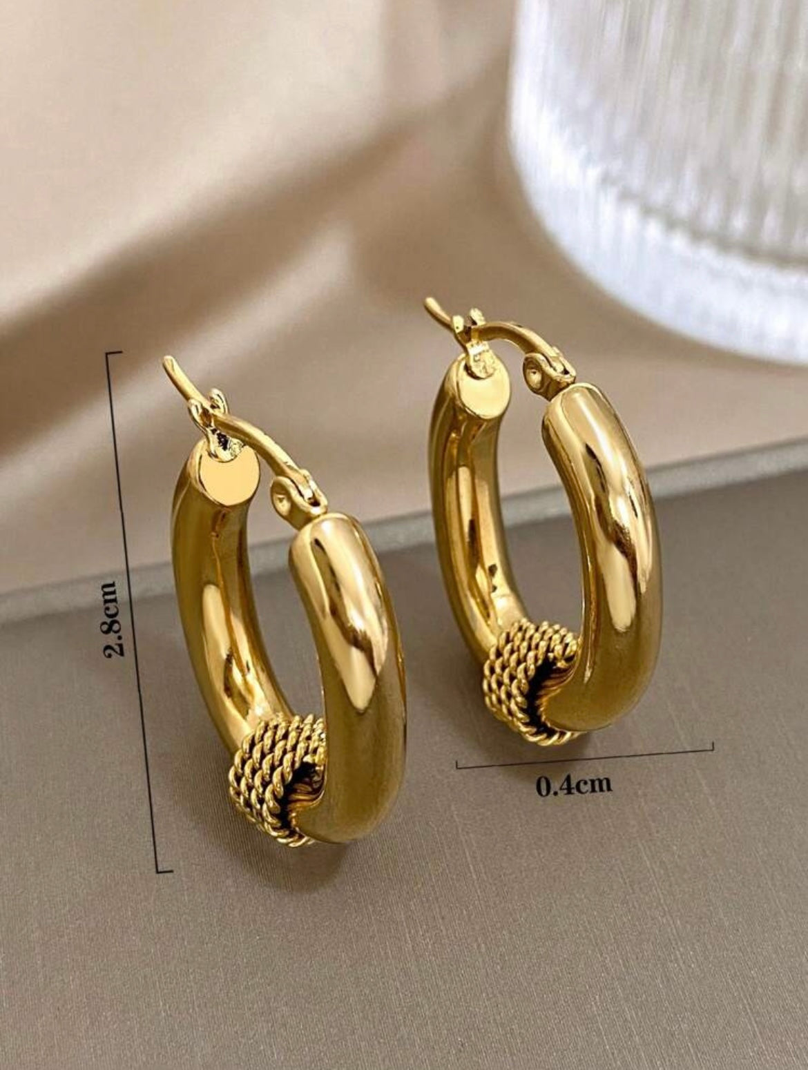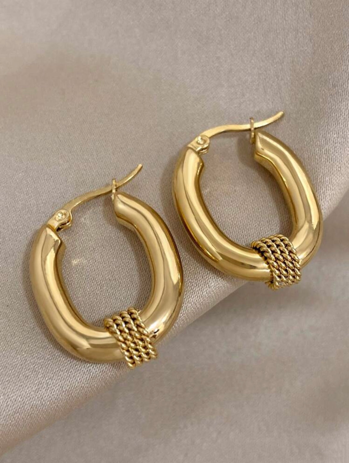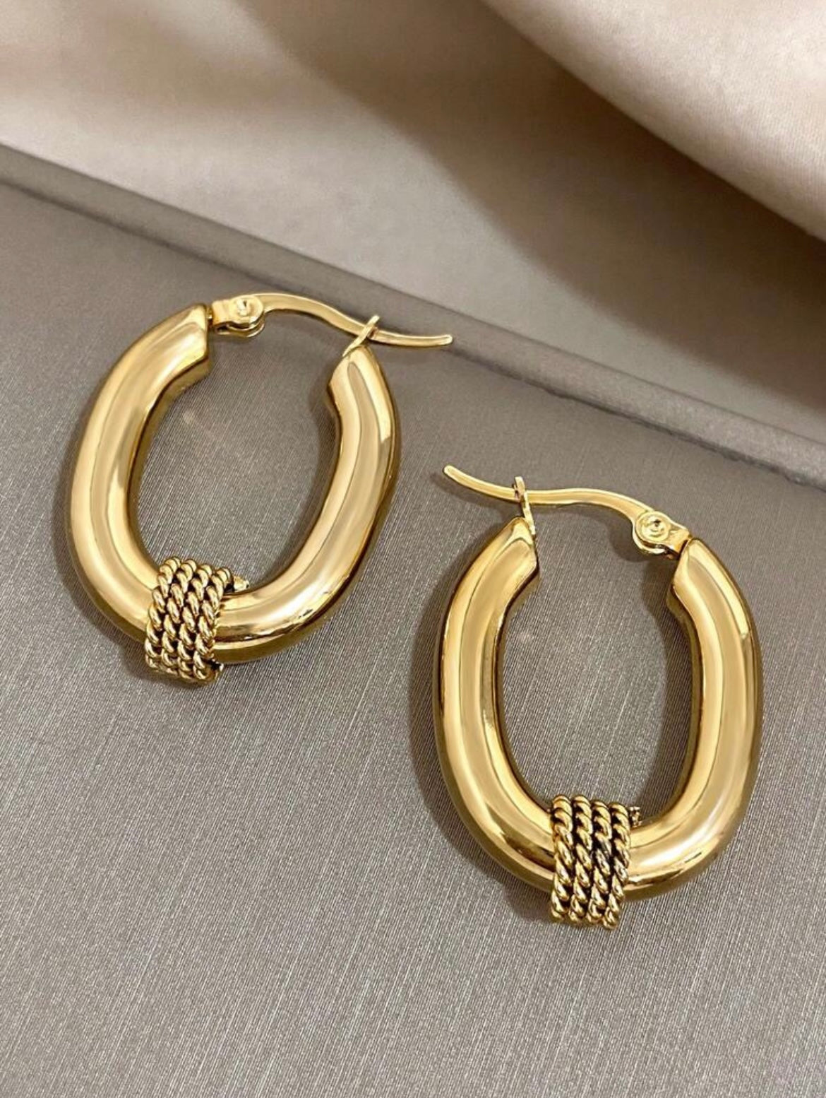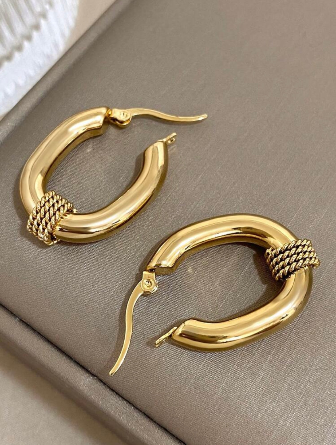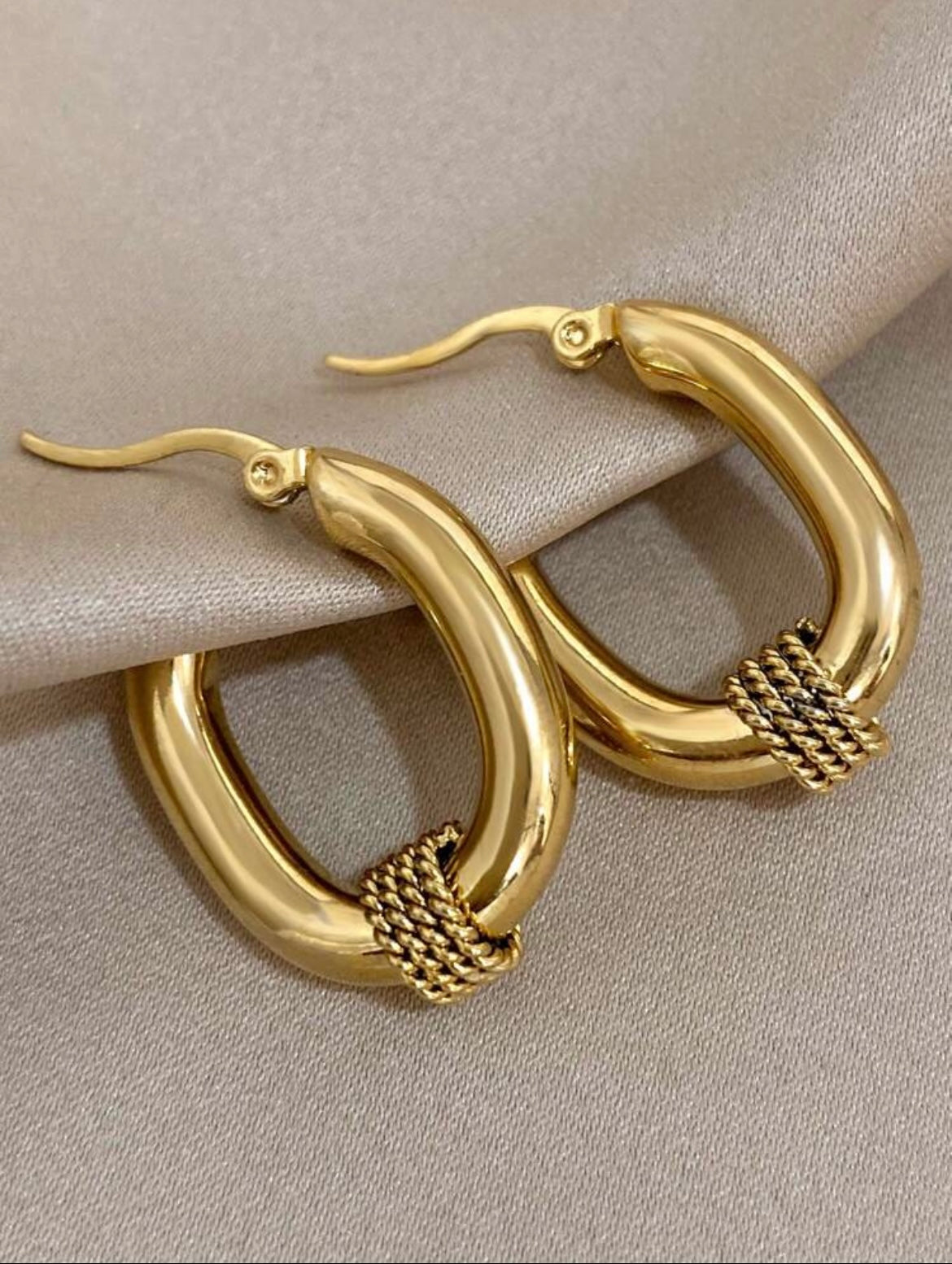 The earrings are gold-colored, oval-shaped hoops featuring a rope knot design.