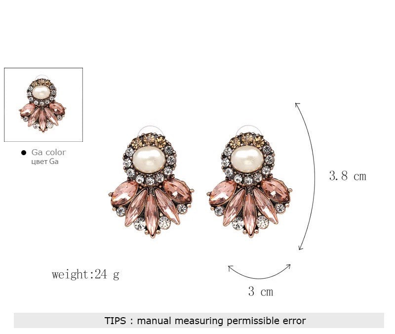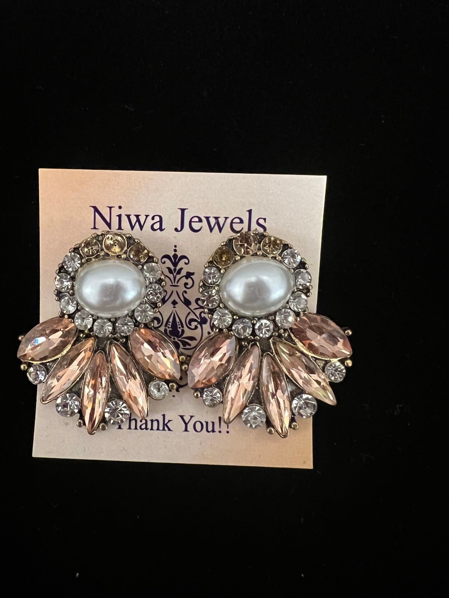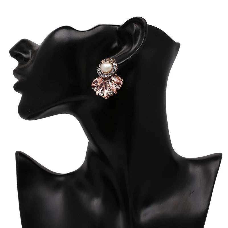 Sophisticated pearl and pink gemstone earrings, featuring a central pearl encircled by clear stones and a graceful fan of pink teardrop accents.