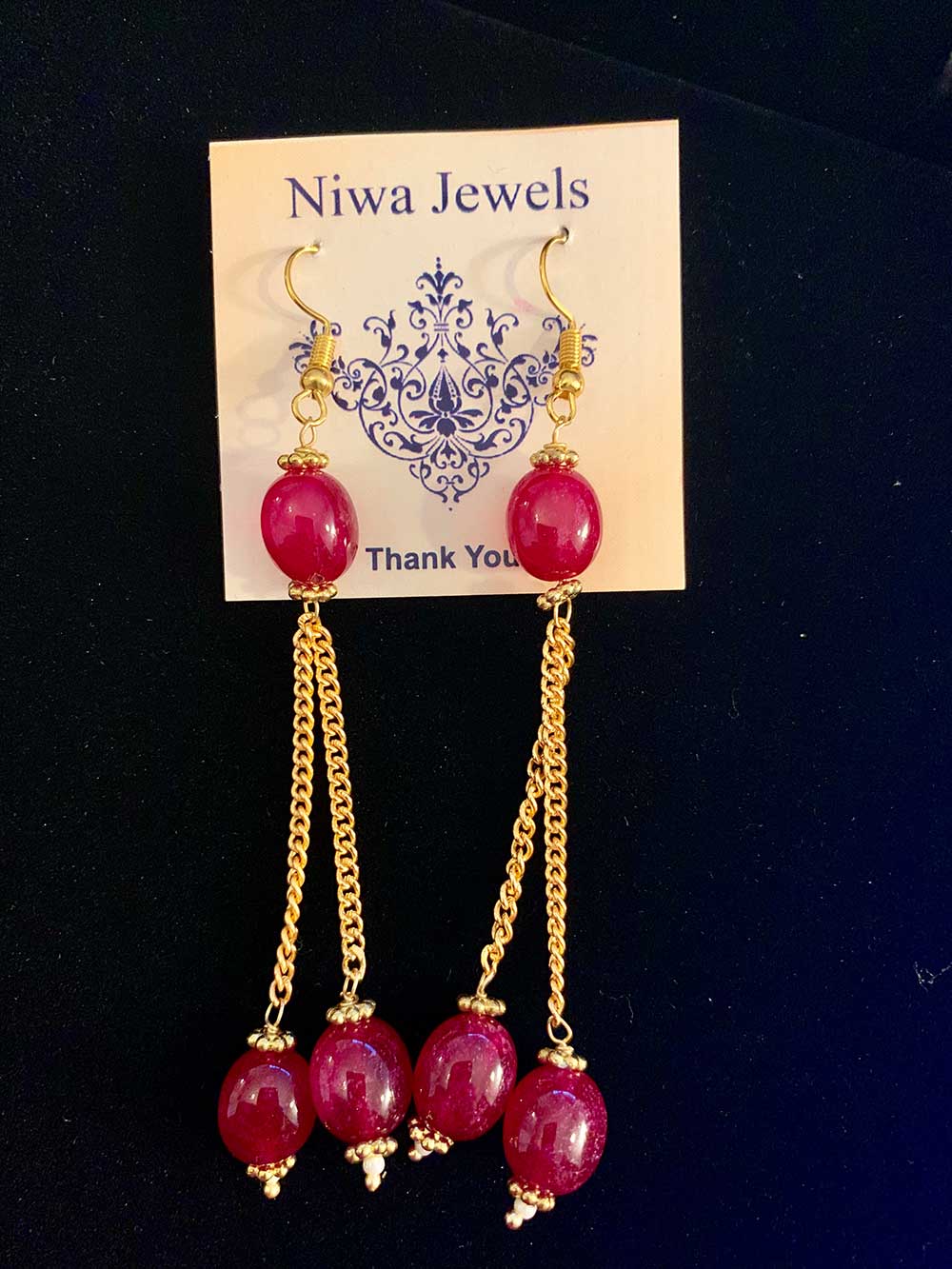 Elegant earrings with a single red bead and three delicate gold chains, each ending in smaller red beads, creating a graceful, cascading design.