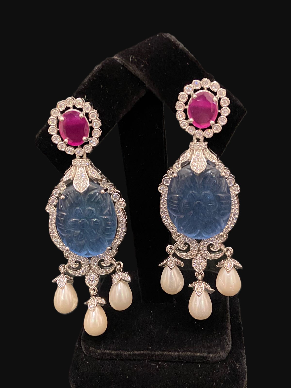 Gold-toned earrings featuring intricately carved blue gemstones, soft pink accents, and luminous pearl drops-exquisite and timeless.