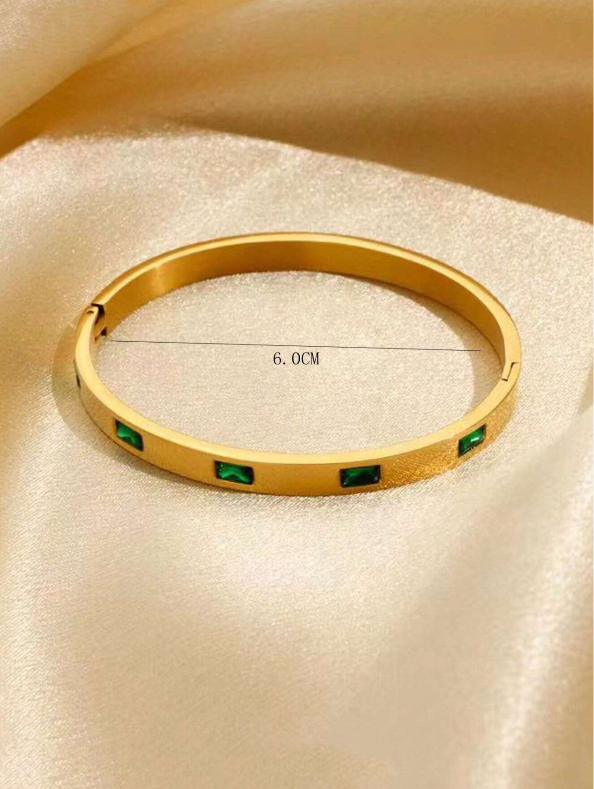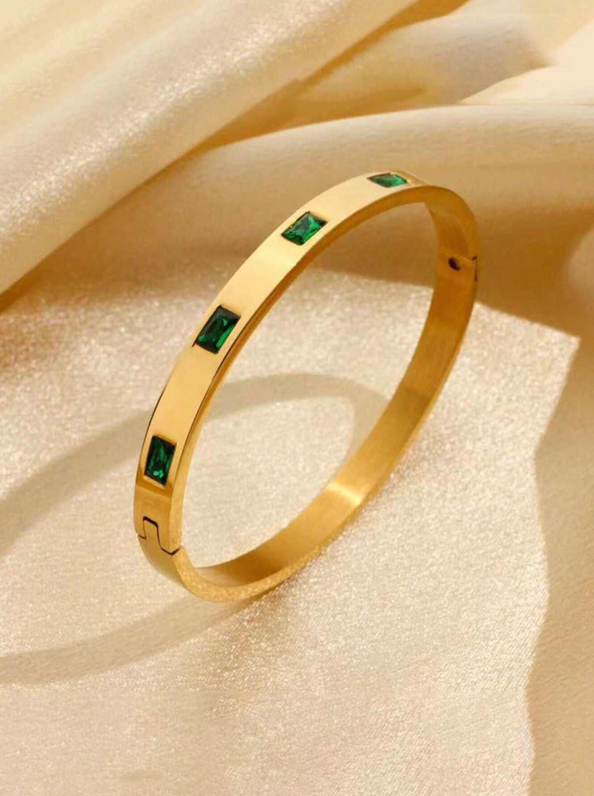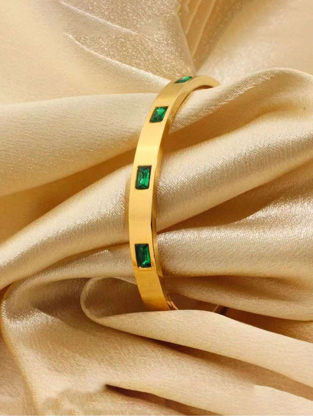 An elegant gold bracelet adorned with five vibrant green gemstones, delicately linked for a refined and timeless appeal.