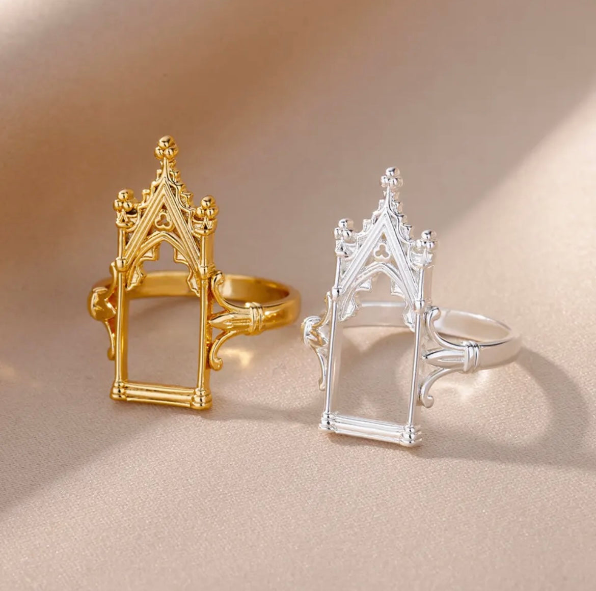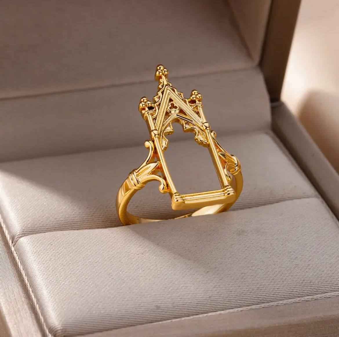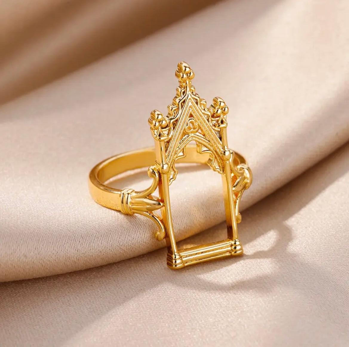 The ring is crafted with polished material and resembling a castle or like a door to heaven.