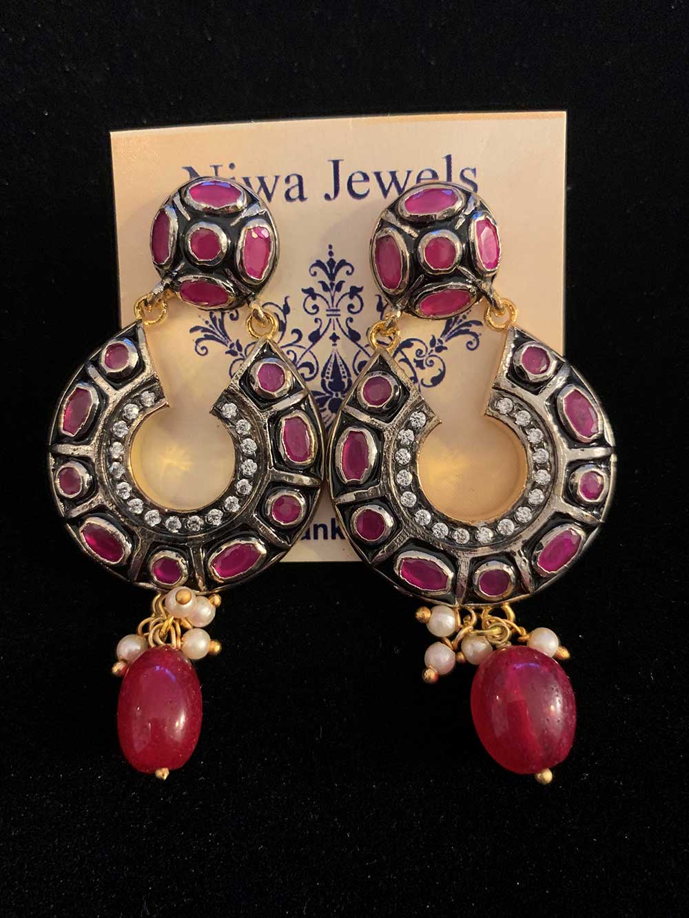 Circular earrings with pink stones, white pearls, and intricate gold accents-gracefully vibrant.
