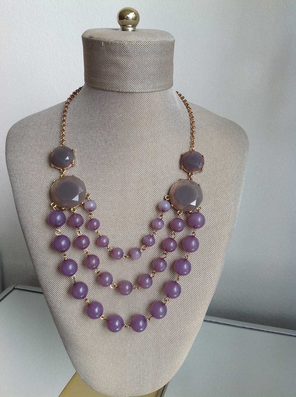 A gold necklace with lavender stones and cascading purple beads-graceful and captivating.