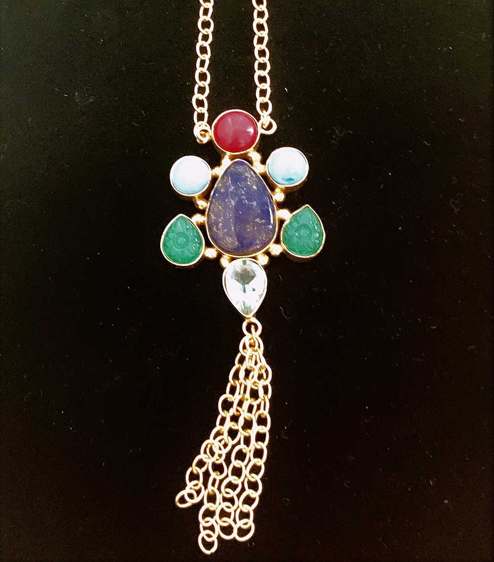 A gold pendant adorned with vibrant gemstones-blue, red, green, and clear-paired with cascading gold chains for a luxurious, colorful allure.