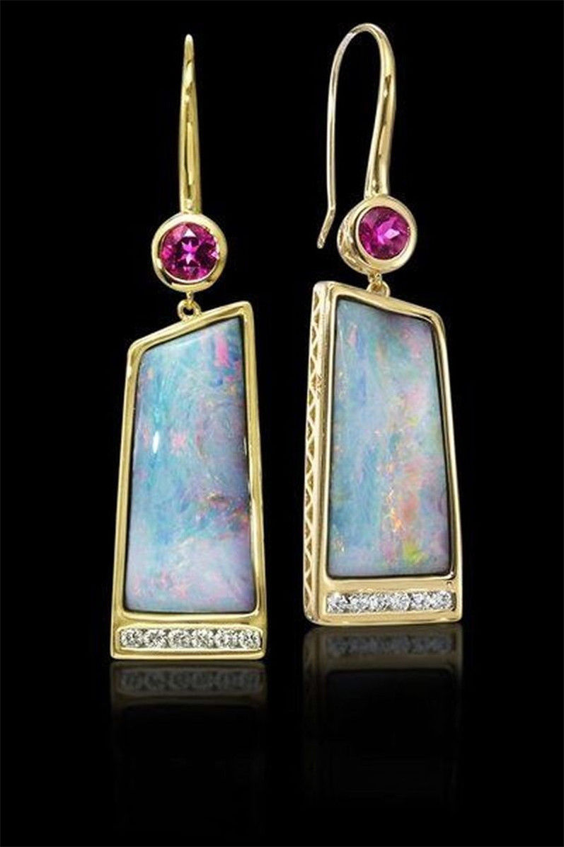 Rectangular opals framed in gold, paired with pink gemstones and diamond accents-luxurious and refined.