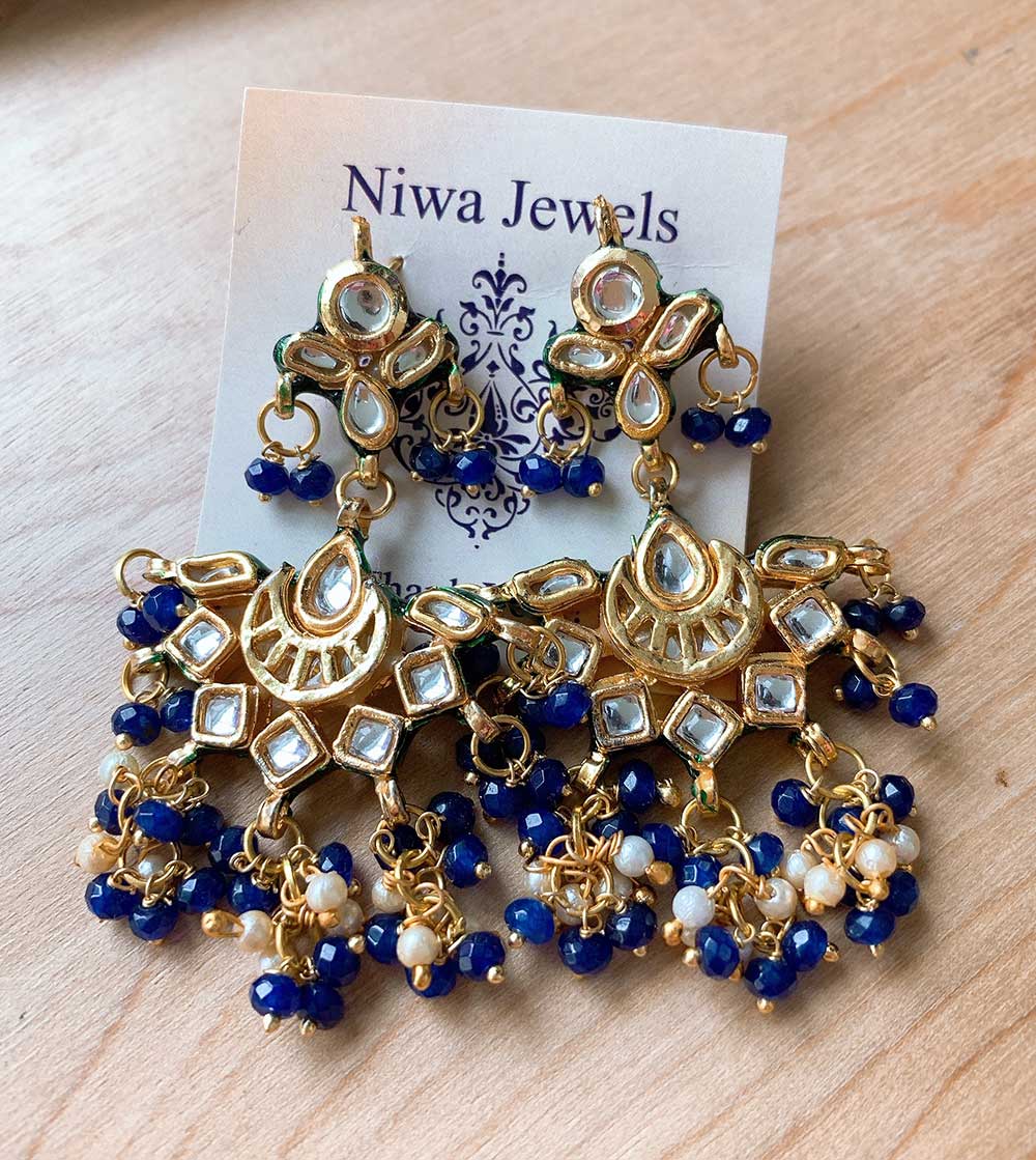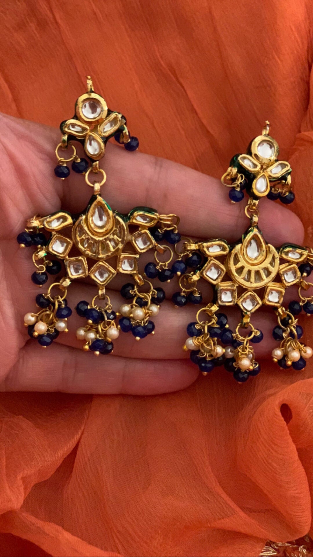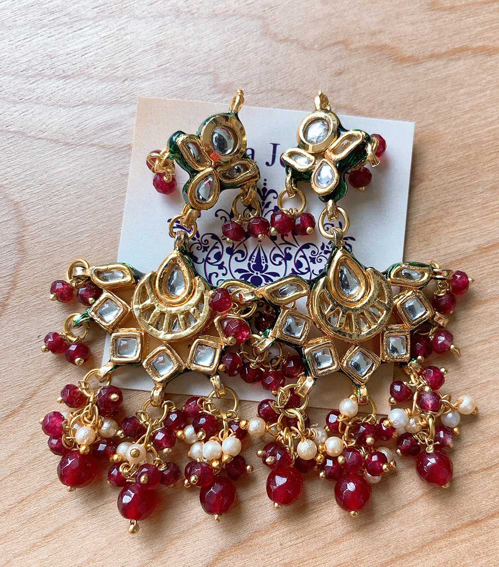 Ornate earrings with gold accents, floral details in green and white, and red beads-vibrantly intricate.