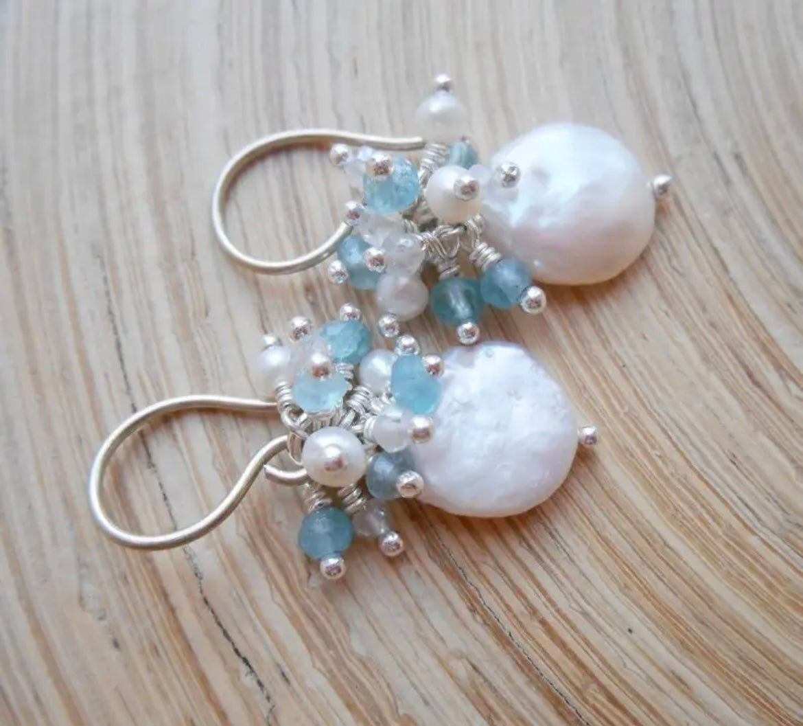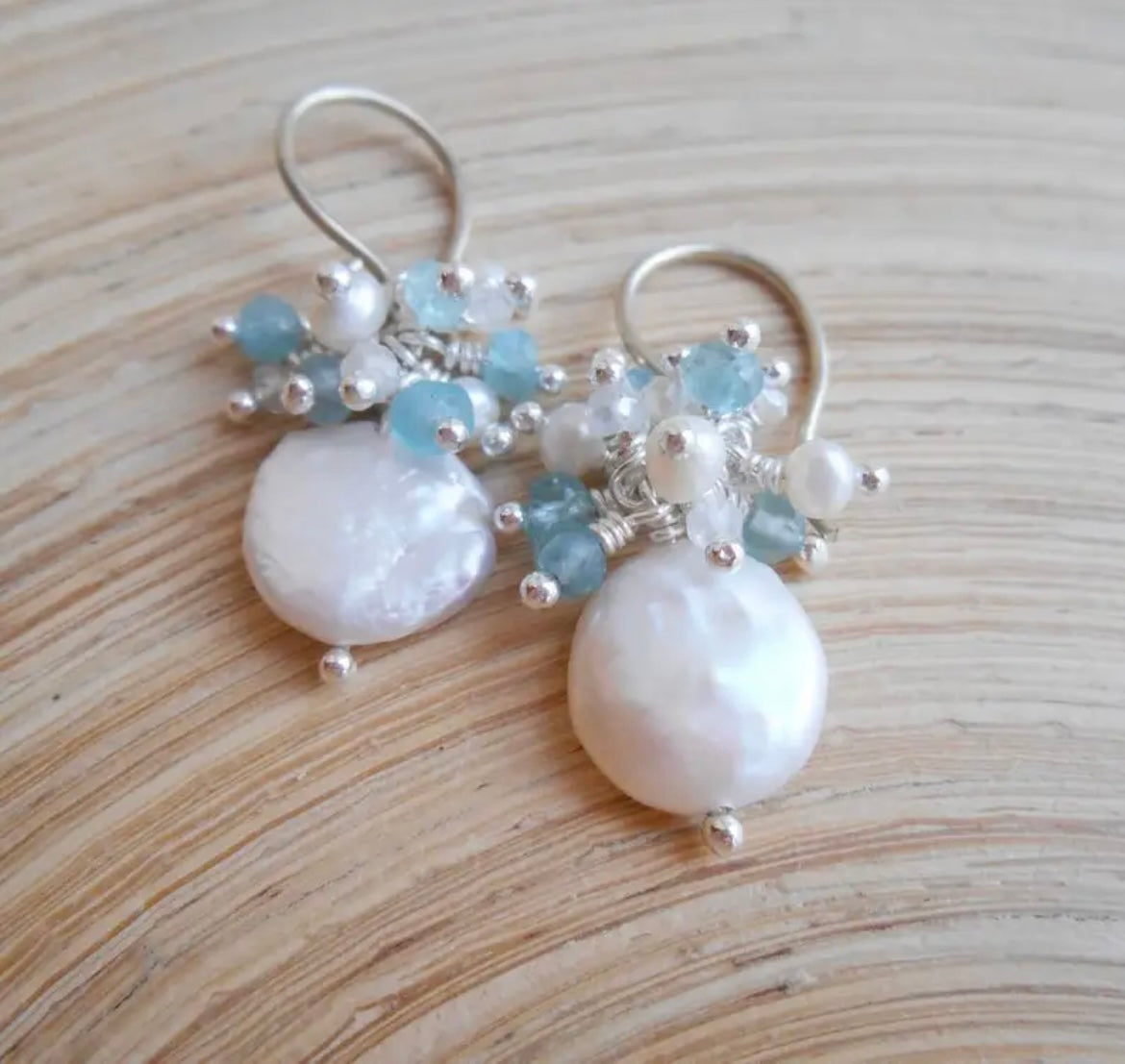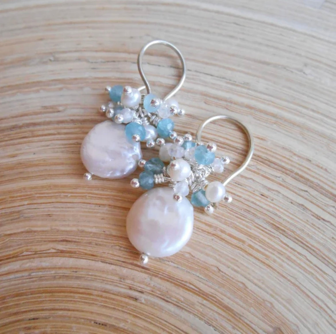 The earrings are identified as coin pearl gemstone cluster earrings .