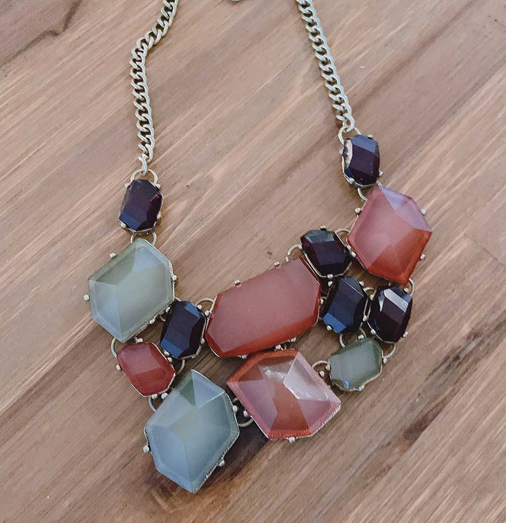A gold necklace with vibrant geometric stones in red, green, and purple-boldly artistic and striking.