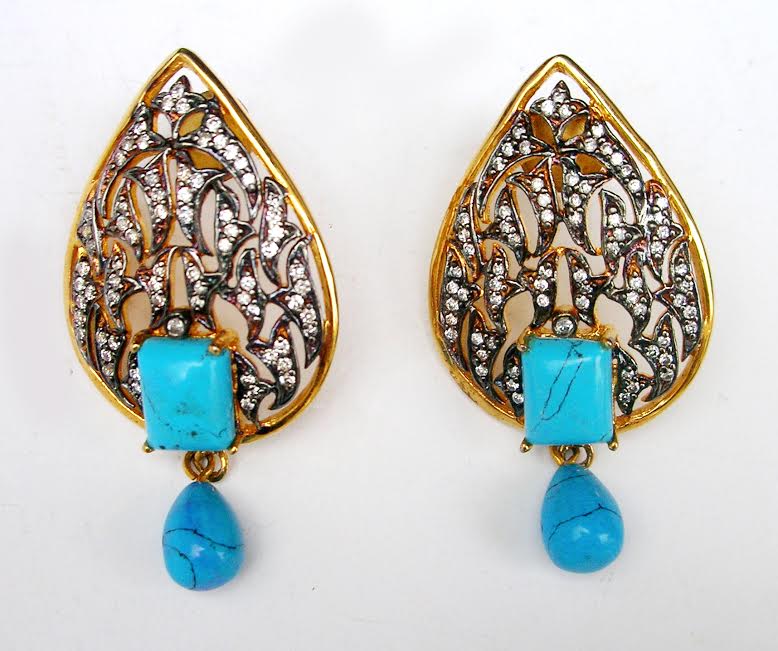 Graceful earrings featuring gold filigree, radiant rhinestones, and vibrant turquoise stones with dangling teardrop accents for timeless allure.
